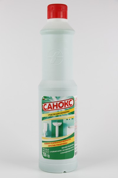 Средство чистящее для сантехники Санокс предназначено для чистки раковин, унитазов, фаянсовых изделий и кафеля от ржавчины, известковых отложений, жировых и прочих загрязнений. Уничтожает возбудителей всех кишечных инфекций. Способ применения: равномерно распределить средство по загрязненной поверхности и оставить на 5-10 минут, потереть губкой или щеткой, затем смыть водой. Содержит щавелевую кислоту. Пользуйтесь резиновыми перчатками. Не рекомендуется для чистки эмалированных поверхностей (кроме покрытий кислотостойкими эмалями).