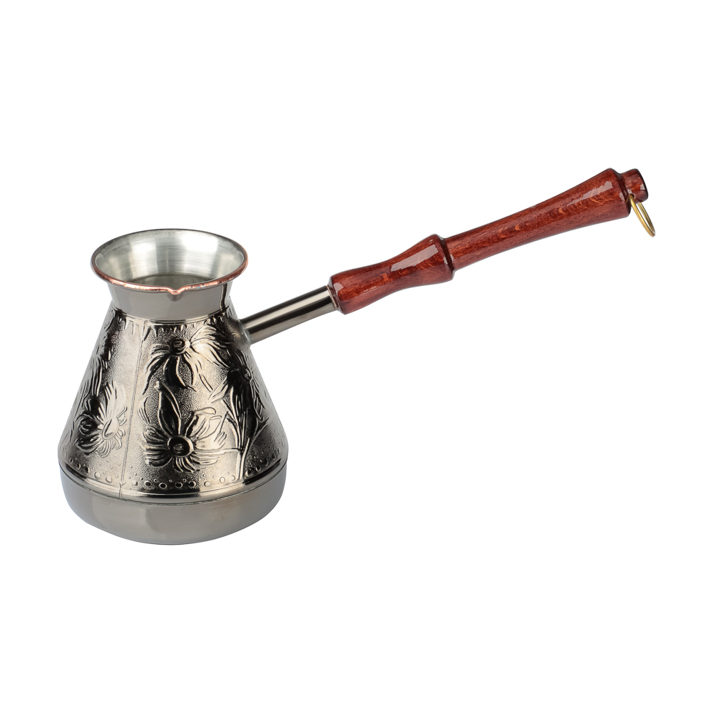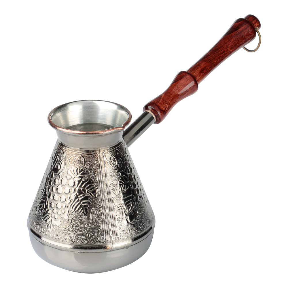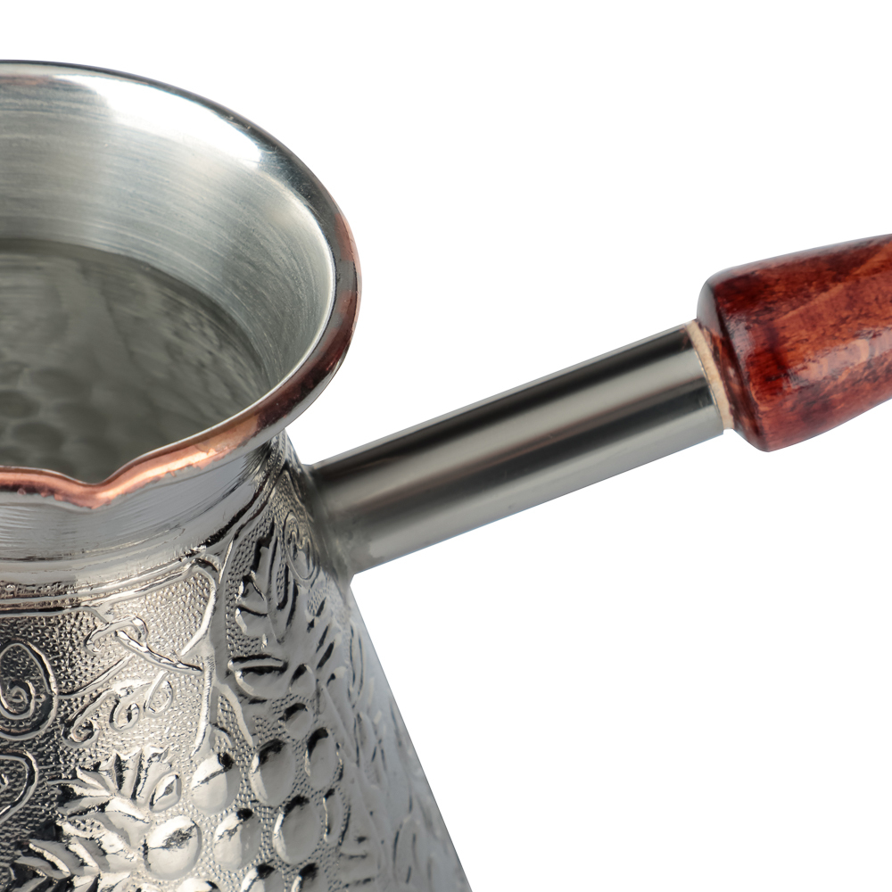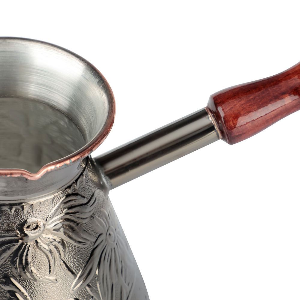 Медная турка для кофе объемом 540мл хорошо проводит тепло и обеспечивает быстрое приготовление классического напитка. Материал не боится ржавчины и механических повреждений. Корпус турки декорирован изящными орнаментами. Добротная ручка выполнена из натурального дерева. Металлическое кольцо позволяет хранить посуду в подвешенном положении.