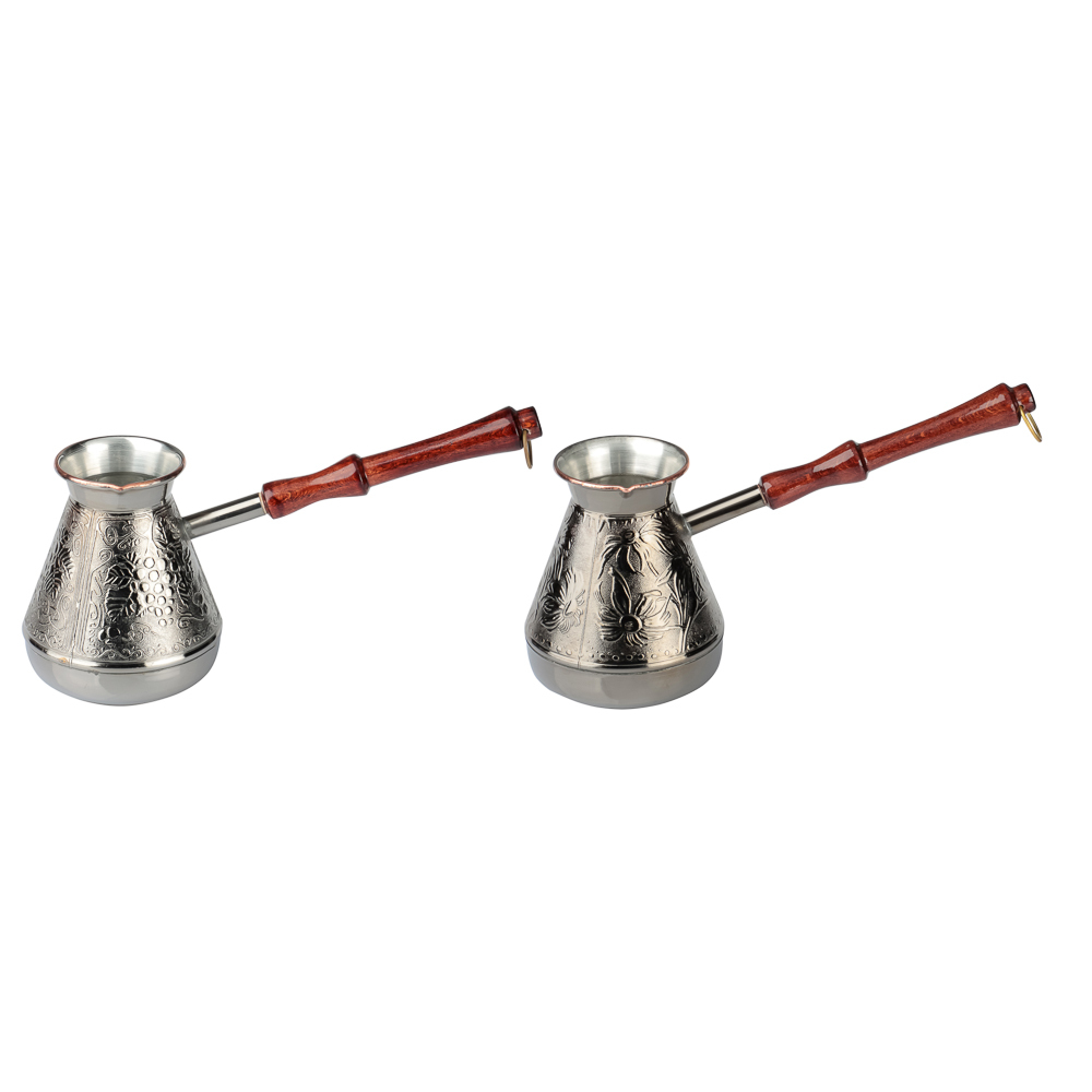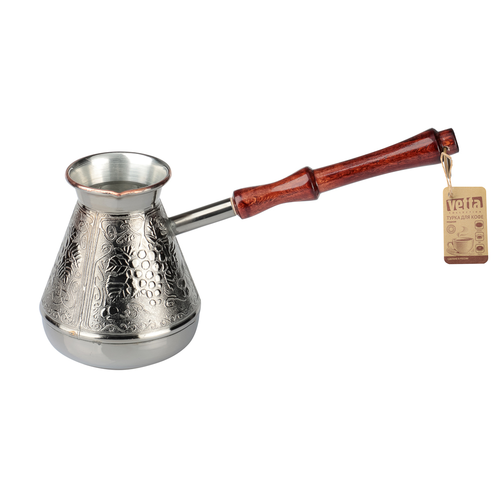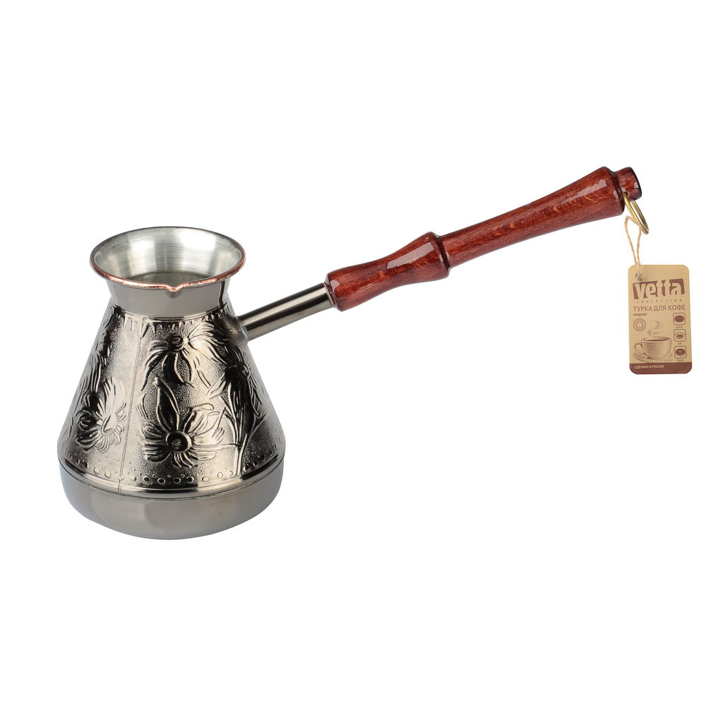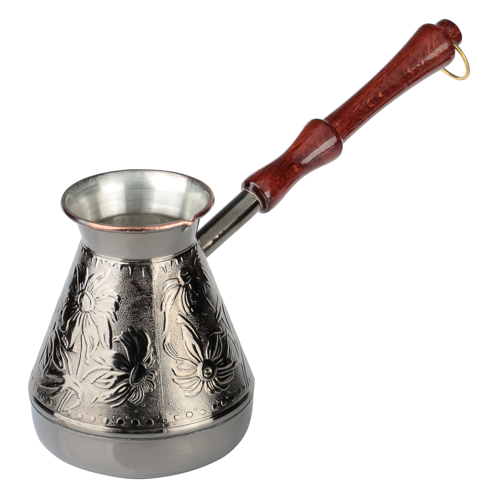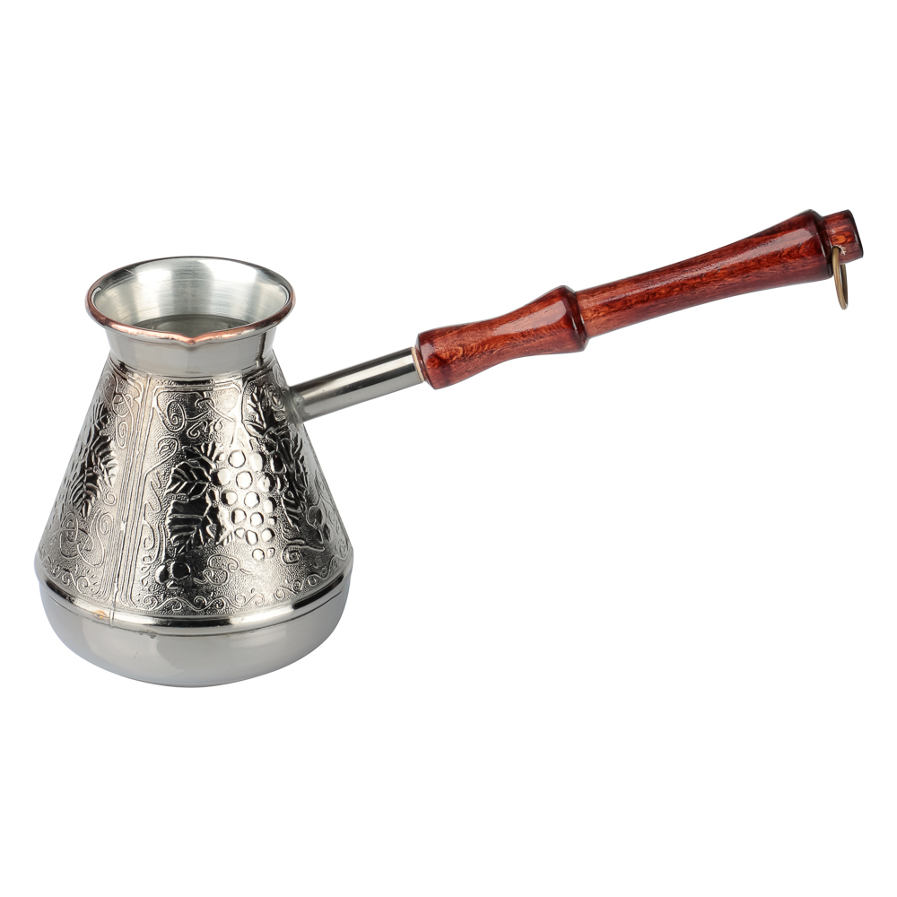 Медная турка для кофе объемом 540мл хорошо проводит тепло и обеспечивает быстрое приготовление классического напитка. Материал не боится ржавчины и механических повреждений. Корпус турки декорирован изящными орнаментами. Добротная ручка выполнена из натурального дерева. Металлическое кольцо позволяет хранить посуду в подвешенном положении.