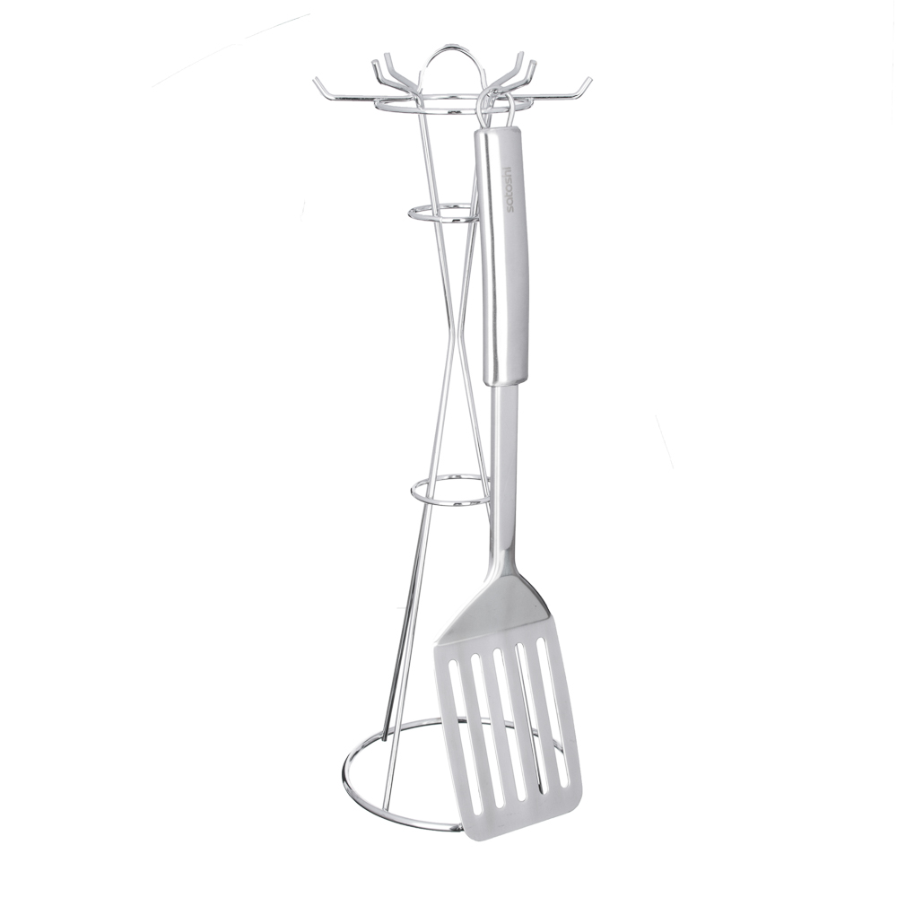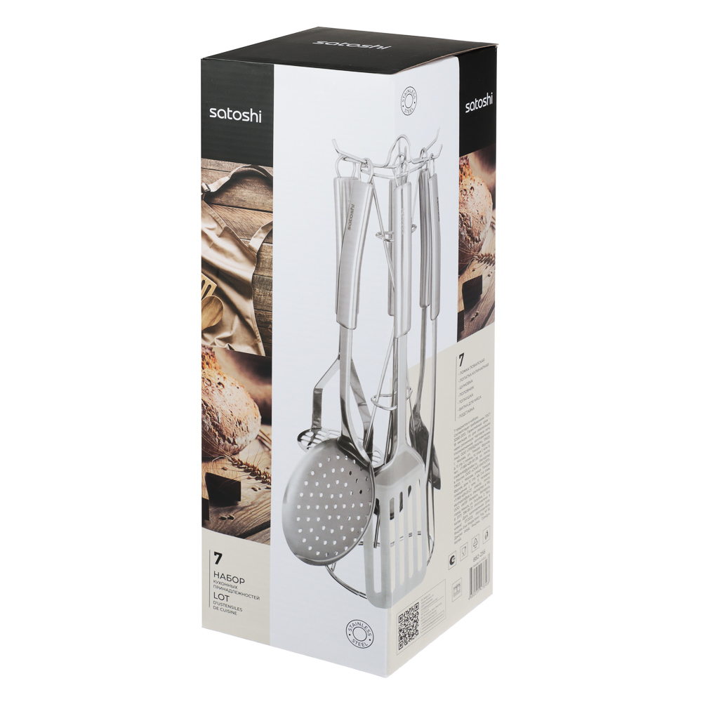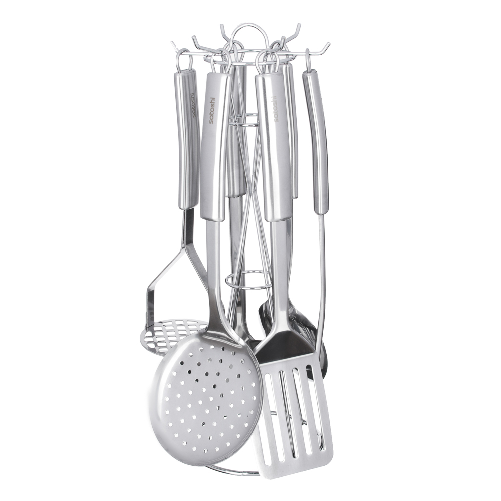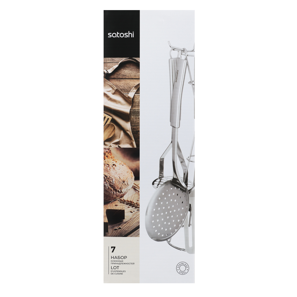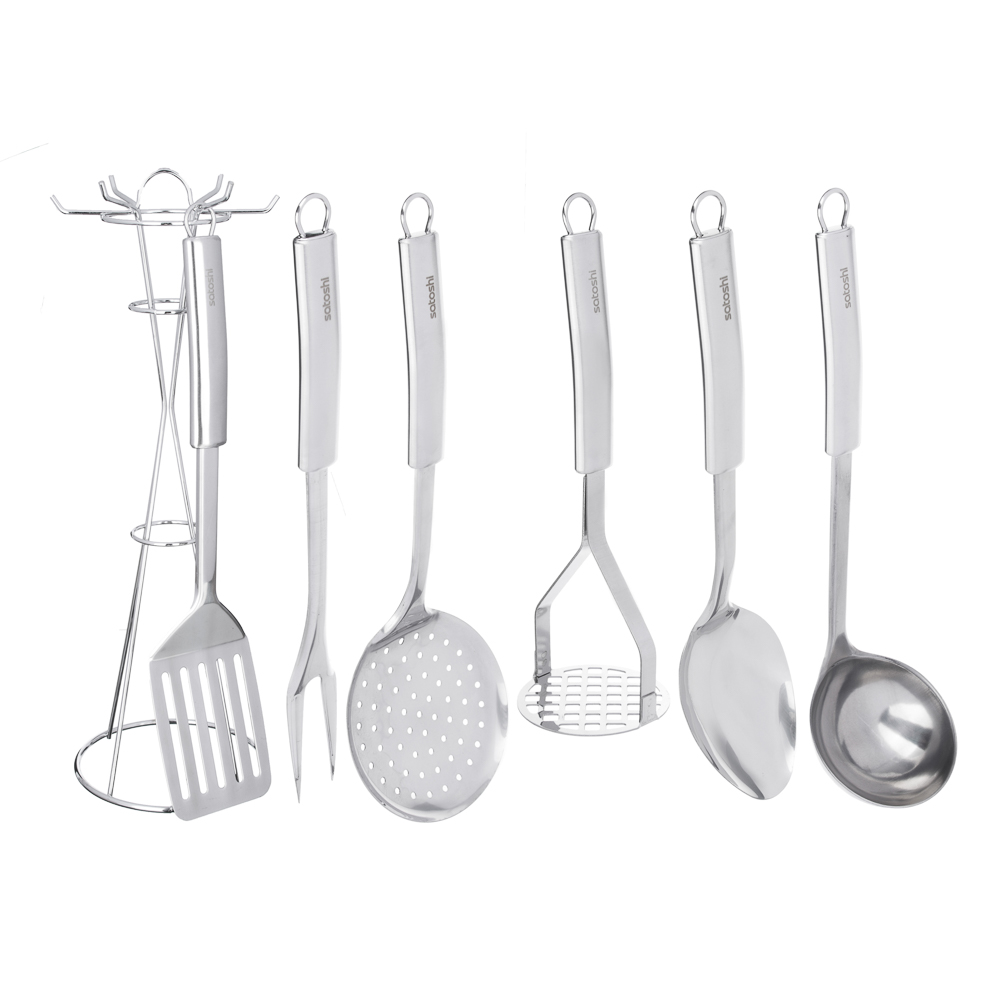 Набор кухонных принадлежностей из нержавеющей стали SATOSHI АЛЬФА включает 7 предметов, которые ежедневно необходимы каждой хозяйке: половник, сервировочную ложку, картофелемялку, шумовку, вилку транжирную для мяса и лопатку с отверстиями. Комплект также оснащен удобной устойчивой подставкой с крючками, которая позволяет хранить все приборы, занимая минимум пространства. Набор имеет современный дизайн и будет красиво смотреться на любой кухне.