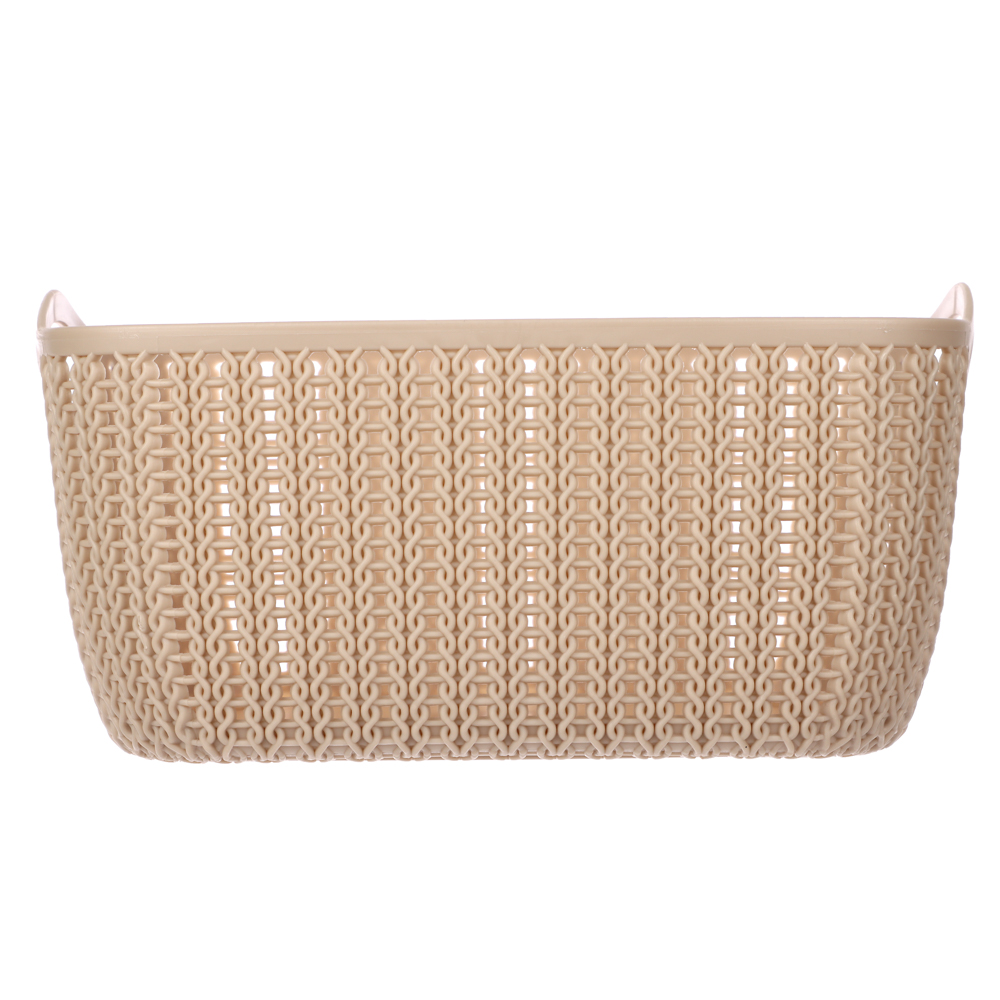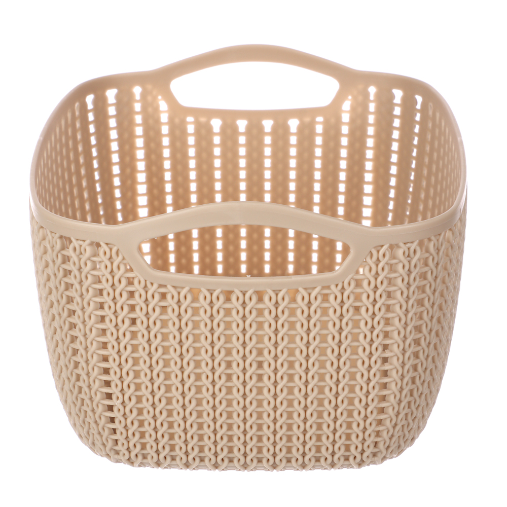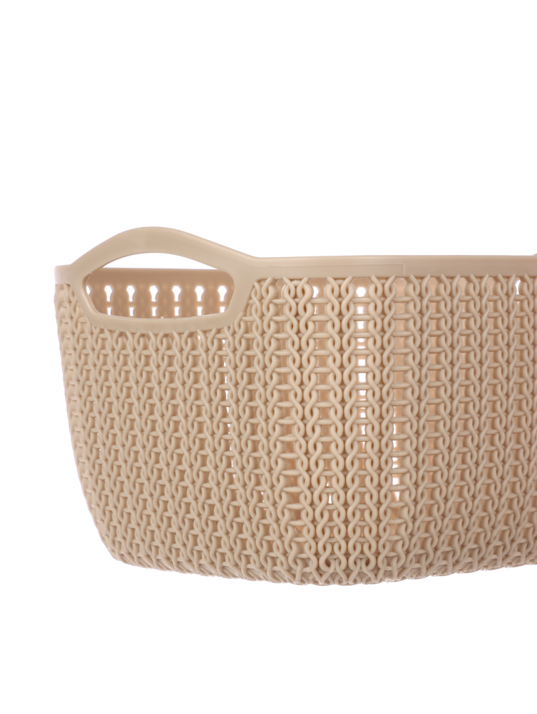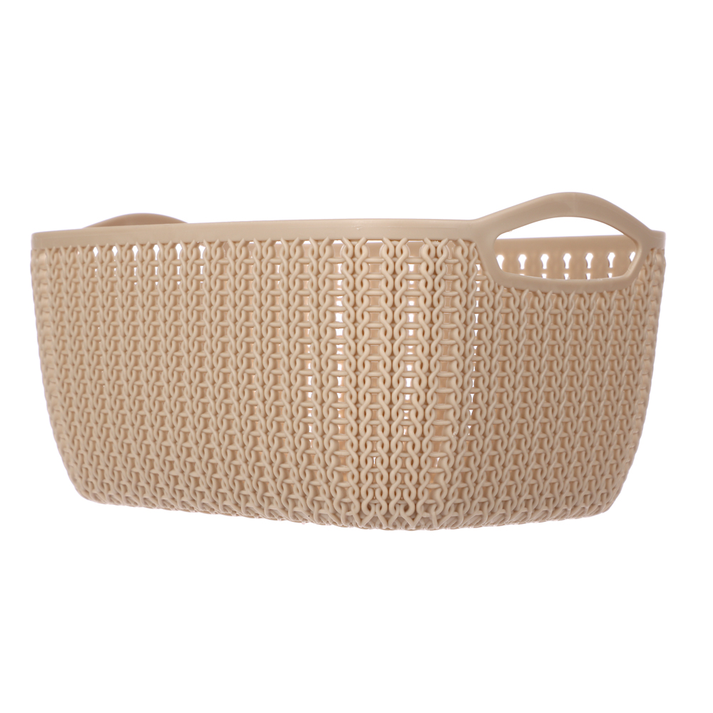 Пластиковая вязанная корзина 21х16х10 см предназначена для хранения самых разных вещей — аксессуаров, белья, пряжи и предметов рукоделия, детских игрушек и туалетных принадлежностей. Для удобной переноски изделия предусмотрены боковые ручки.