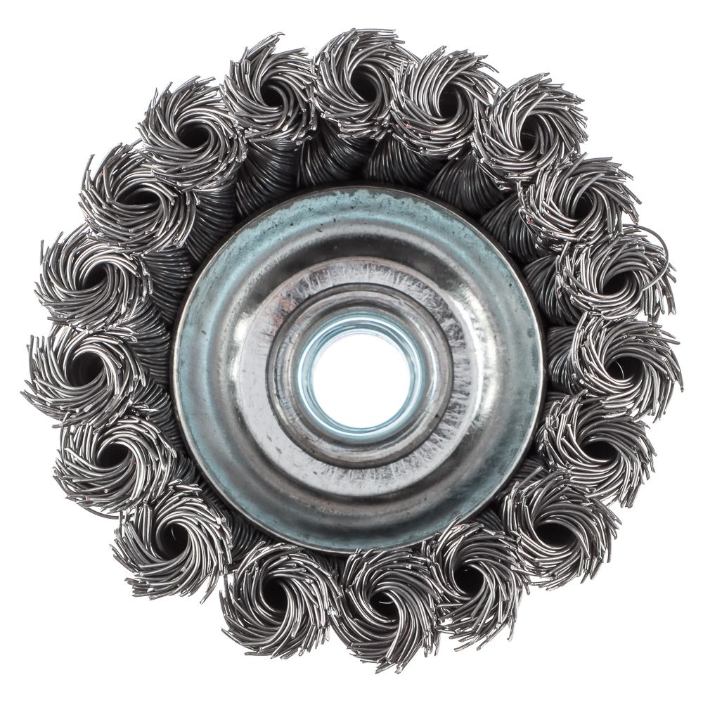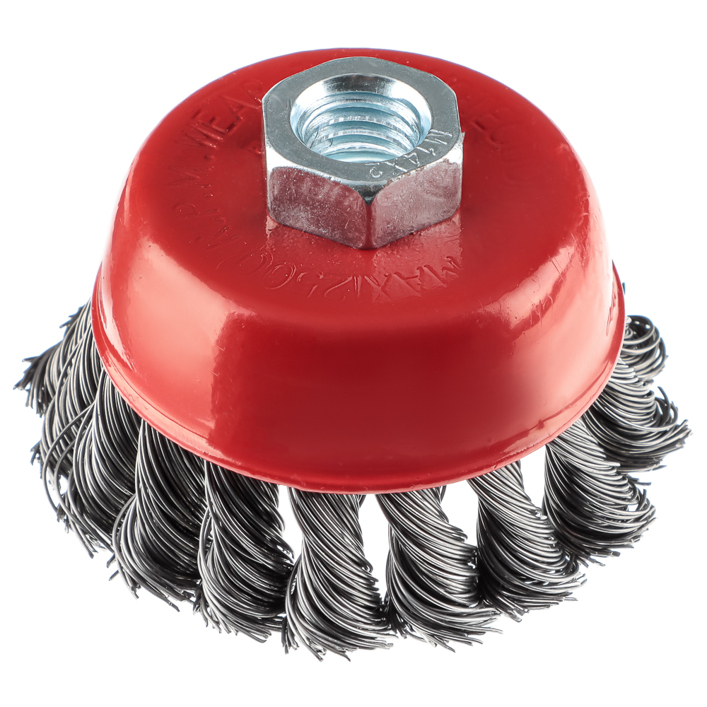 Металлическая щетка для УШМ ЕРМАК «Чашка» крученая 75мм/М14 имеет особую твердость и износостойкость и применяется для грубой очистки любых металлических поверхностей, а также выемок и фасок от ржавчины и грязи. Эффективна для зачистки сварных швов. Усилительное кольцо дольше сохраняет форму щетины, а посадочная гайка надежно фиксирует щетку на УШМ без риска соскока во время работы. Применяется на УШМ с максимальной производительностью до 125000 об./мин.