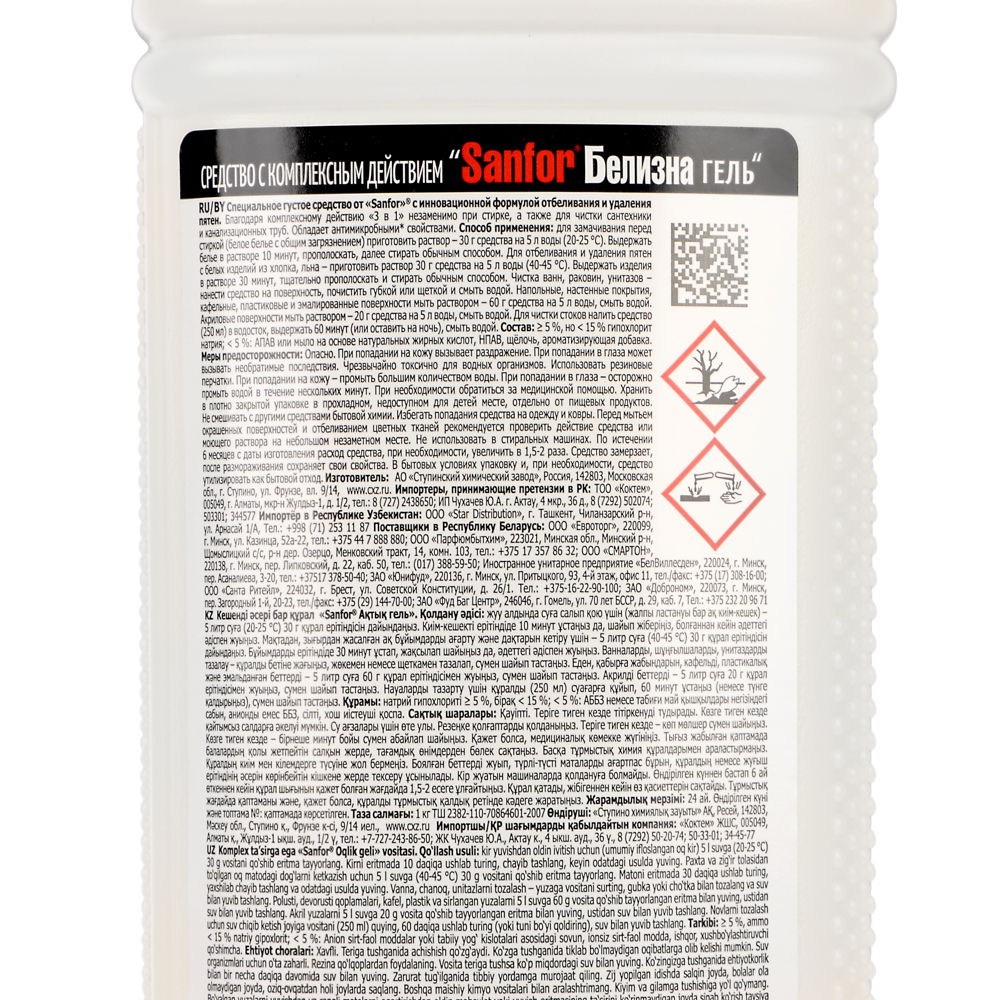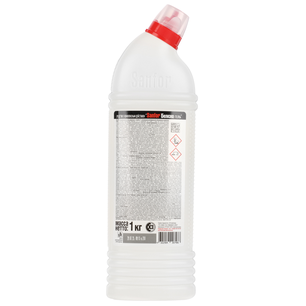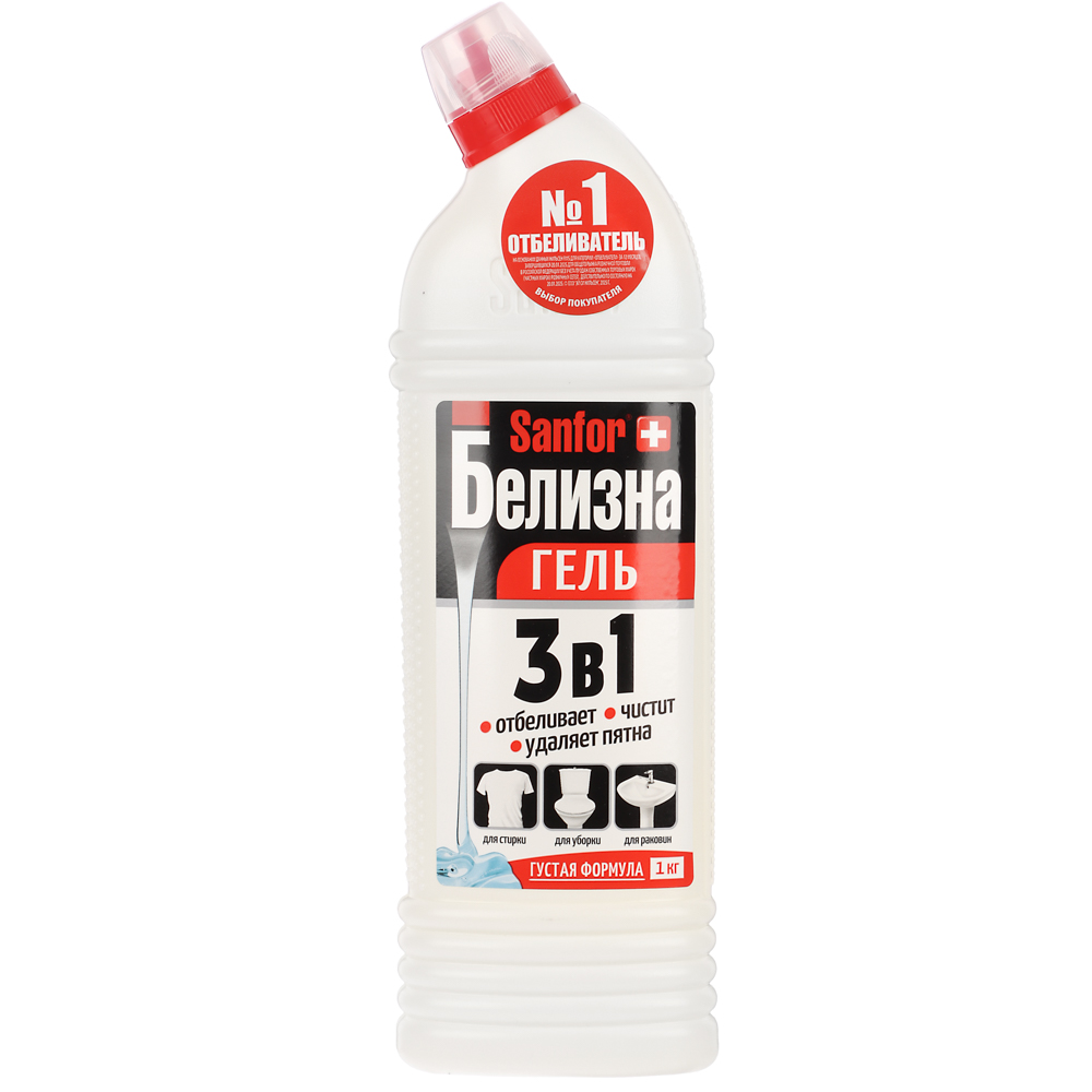 Sanfor "Белизна 3 в 1" — специальное густое средство с инновационной формулой отбеливания и удаления пятен. Благодаря комплексному действию незаменимо при стирке, а также для дезинфекции и чистки сантехники и труб. Многофункциональное средство отбеливает, дезинфицирует, чистит: ванны, раковины, унитазы, канализационные стоки, пол, кафель, пластик, посуда (кроме металлической). Загущенная консистенция хорошо удерживает гель на вертикальных поверхностях. Флакон Sanfor имеет крышку “Защита от детей”, что позволяет безопасно использовать его также и в детских учреждениях. С Sanfor ваши близкие будут в безопасности!