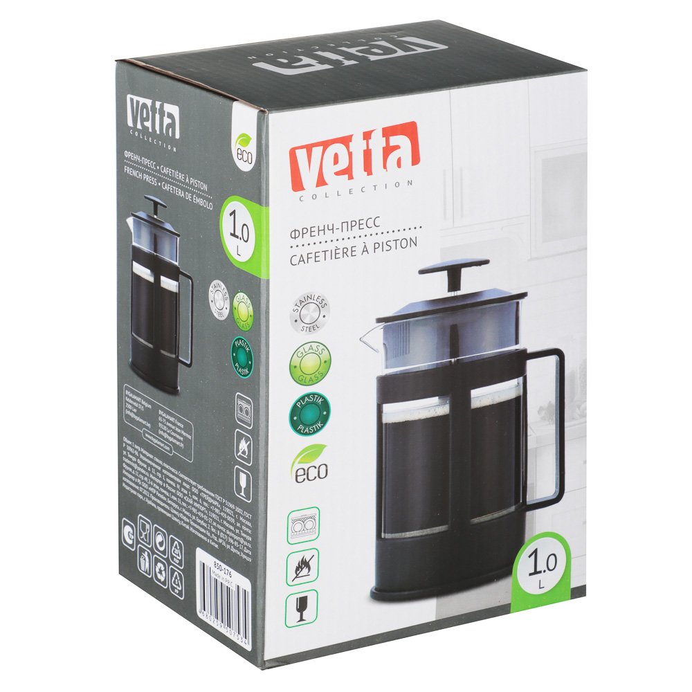 Френч-пресс VETTA "Мелана" 1 л — идеальное решение для ценителей насыщенного кофе. Объём рассчитан на 4-5 порций, что делает его отличным выбором для семьи или компании. Колба из жаропрочного стекла устойчива к термическим нагрузкам и выдерживает нагрев до 200°C, сохраняя тепло и аромат напитка. Фильтр-поршень из нержавеющей стали обеспечивает герметичное прилегание и эффективное отделение кофейной гущи. Устройство легко разбирается и моется в посудомоечной машине. Эргономичный дизайн сочетает в себе лаконичность и практичность для ежедневного использования.