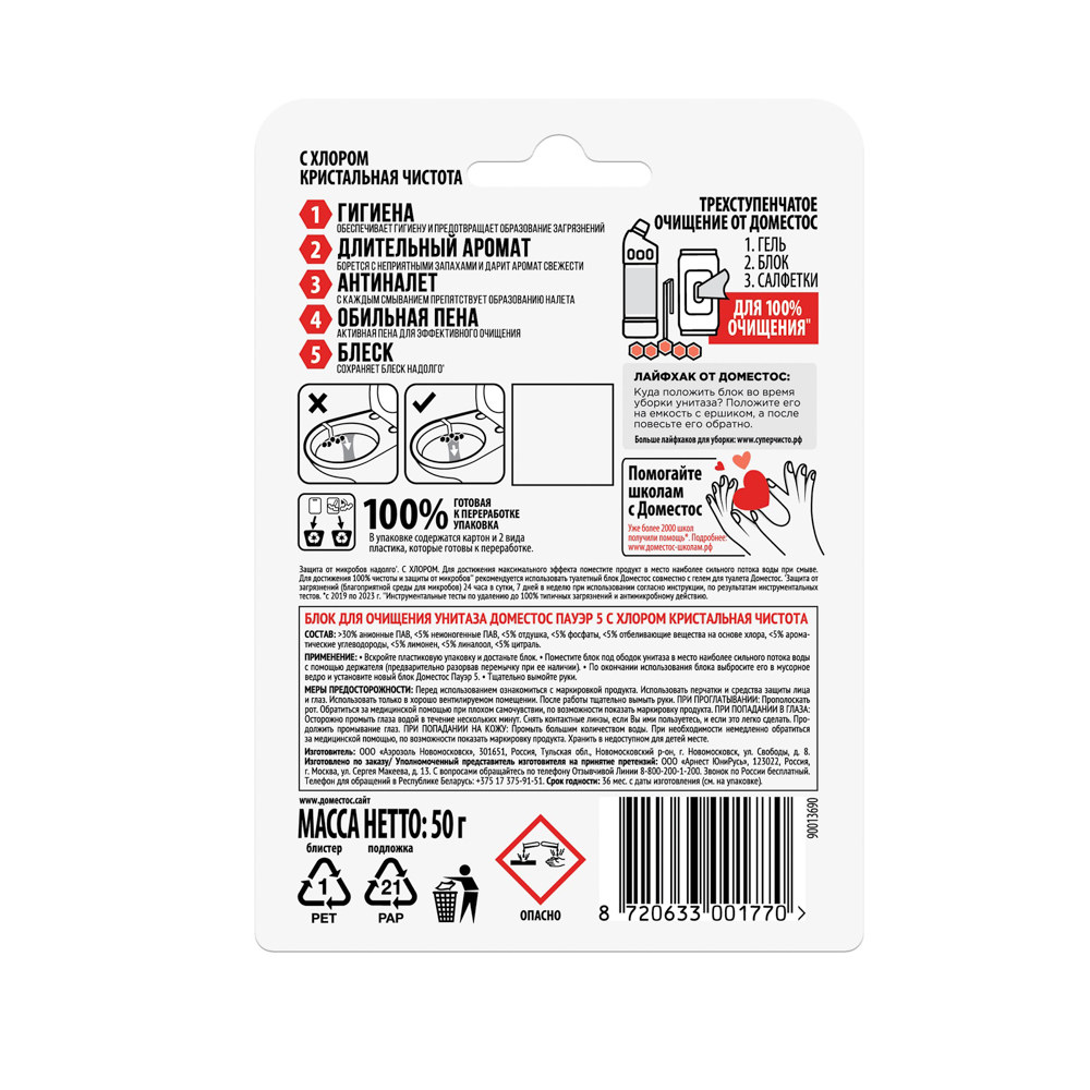 Доместос Пауэр Кристальная чистота — это инновационный блок для автоматического очищения унитаза. Формула с усиленным хлором обеспечивает мощное дезинфицирующее действие, эффективно уничтожая бактерии и вирусы и предотвращая их дальнейшее размножение.Аромат «Ледяная лавина» дарит ощущение абсолютной свежести и чистоты, наполняя пространство вокруг кристальным и прохладным благоуханием. Средство борется с неприятными запахами, обеспечивая длительный эффект.