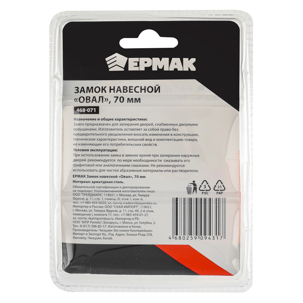 Навесные замки торговой марки ЕРМАК - это надежный защитник любого помещения.Простая надежная конструкция замка повышает стойкость к взлому, а стальная закаленная дужка снижает вероятность её распила. Корпус изготовлен из специальной стали, что гарантирует долгий срок службы.
