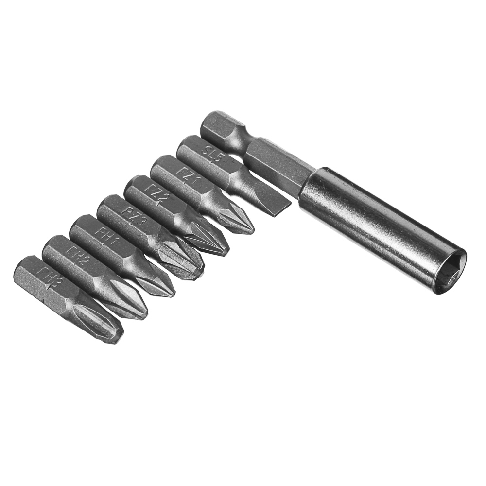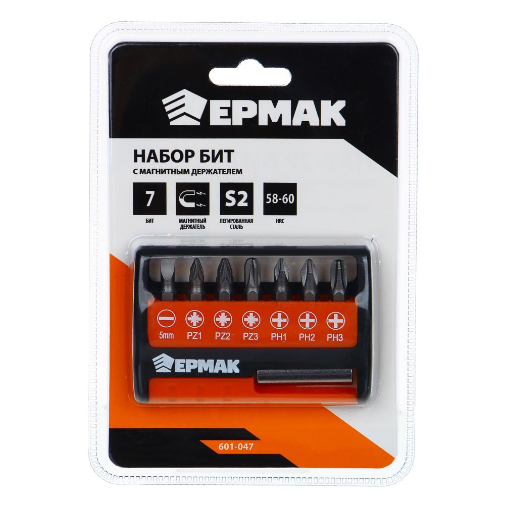 Набор бит для шуруповерта с магнитным держателем ЕРМАК предназначен для работы с шурупами и винтами. Включает 7 бит, изготовленных из высококачественной легированной стали S2 с повышенной твердостью 58-60 HRC, а также удлинитель с держателем для бит. Набор содержит биты со следующими типами шлицев: плоский 5 мм, PZ1, PZ2, PZ3, PH1, PH2, PH3. В комплект также включен компактный пластиковый кейс для хранения с маркировкой бит. Длина бит - 25 мм.