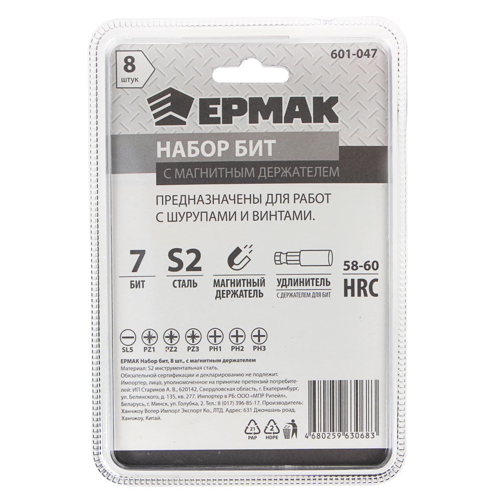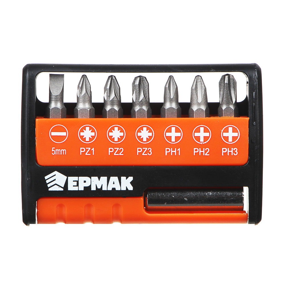 ЕРМАК Биты для шуруповерта, набор 8шт с магнитным держателем, удобный кейс, длина бит 25 мм