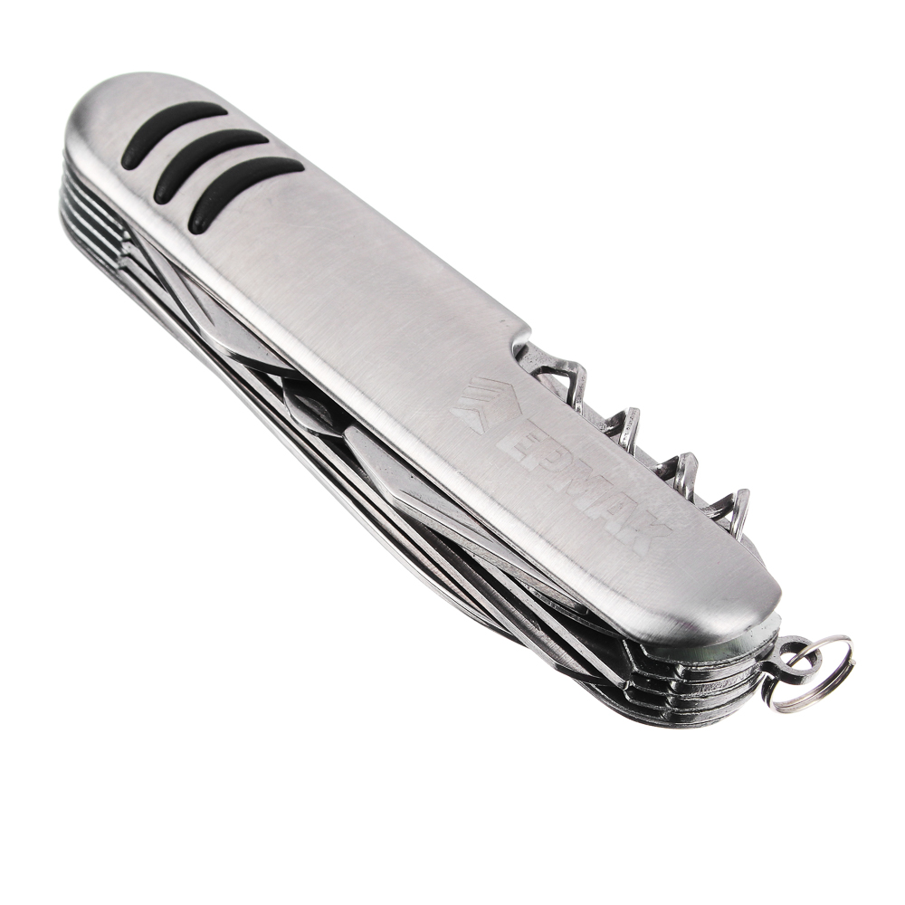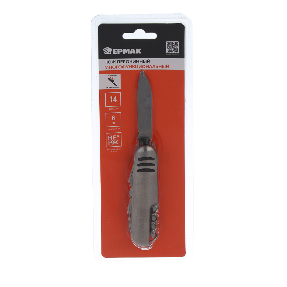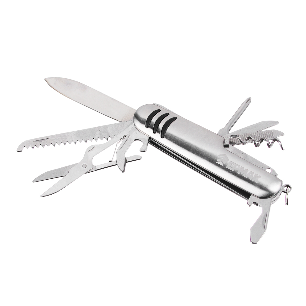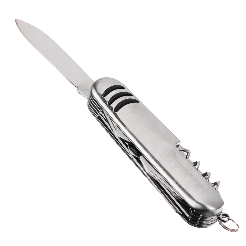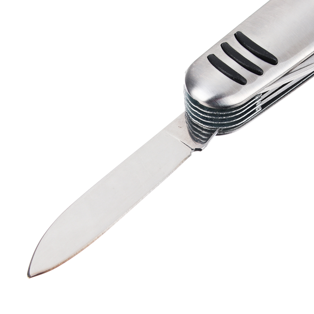 Компактный и многофункциональный перочинный нож из нержавеющей стали. Пригодится на охоте, рыбалке, в походе или на даче. Нож не боится влаги, очень прочный. Сочетает 14 функций, с помощью него можно резать, пилить, открывать. Удобный и не очень большой размер 9 см, с этим ножом Вы почувствуете удобство, избавитесь от многих хлопот и будете брать его с собой во все поездки. Функции: • Нож; • Пила; • Открывалка для бутылок; • Плоская малая отвертка 2 мм; • Нитевдеватель; • Штопор; • Крестовая отвертка; • Очиститель для ногтей; • Пилка; • Скребок; • Ножницы; • Консервный нож; • Скребок для чистки рыбы; • Инструмент для извлечения рыболовного крючка.