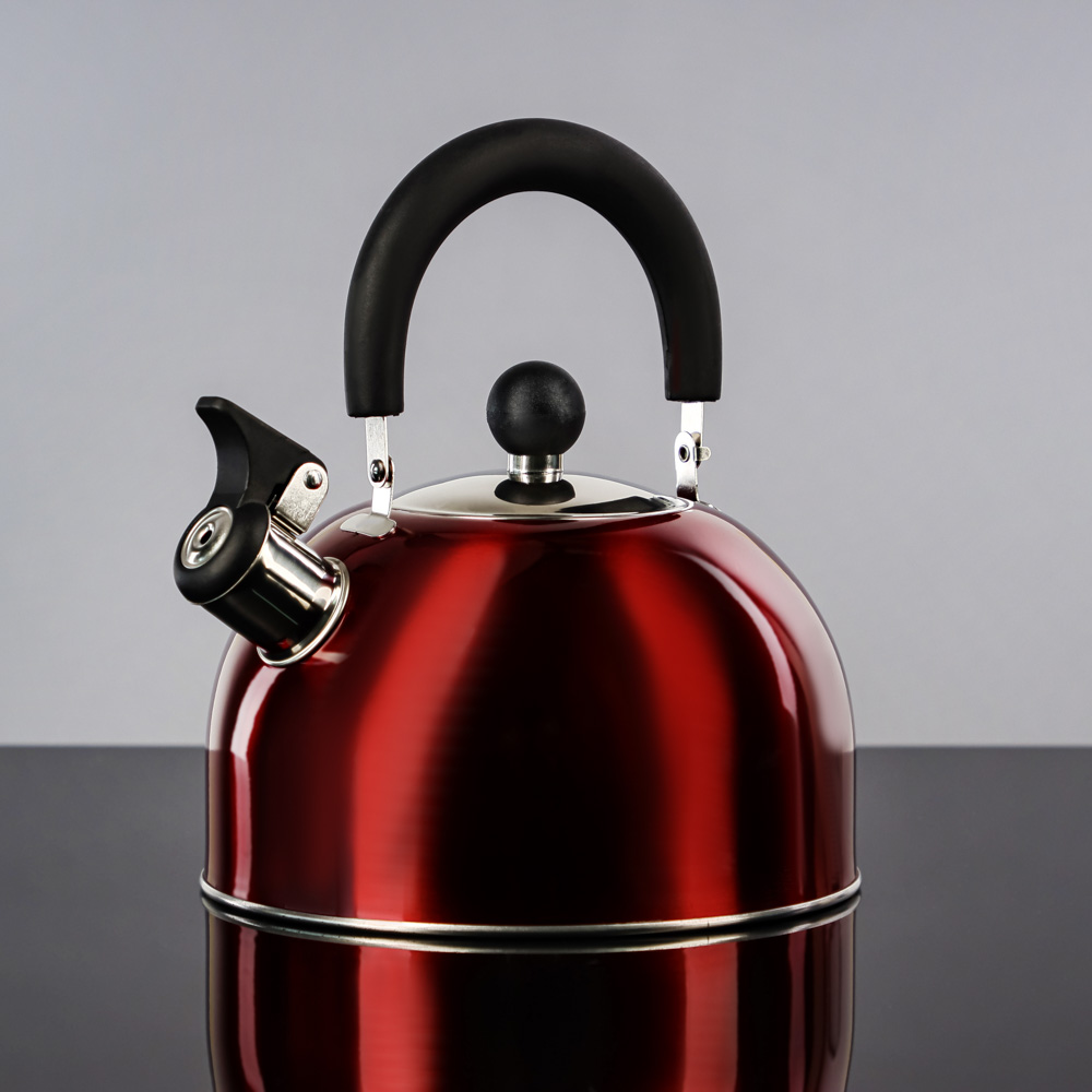 Чайник объемом 2,5 л изготовлен из нержавеющей стали, красного цвета, с несъемным свистком и бакелитовой ручкой черного цвета подходит для всех типов плит, включая индукцию.