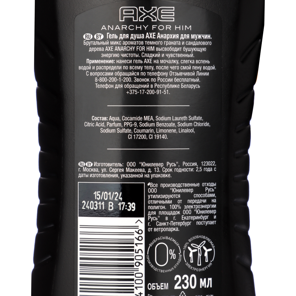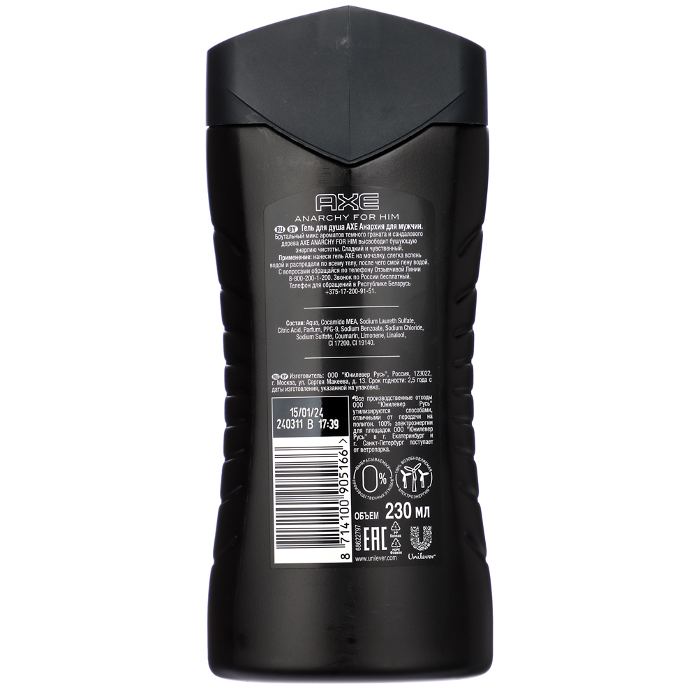 Гели для душа AXE – это гладкое и глубокое очищение по-мужски. Гель Анархия с ароматом темного граната и сандалового дерева. Гель для душа AXE Anarchy смягчает кожу и при этом не нарушает естественный кислотно-щелочной баланс. Средство прекрасно мылится, интенсивно ухаживает и эффективно питает. А свежий лёгкий аромат дарит заряд бодрости.