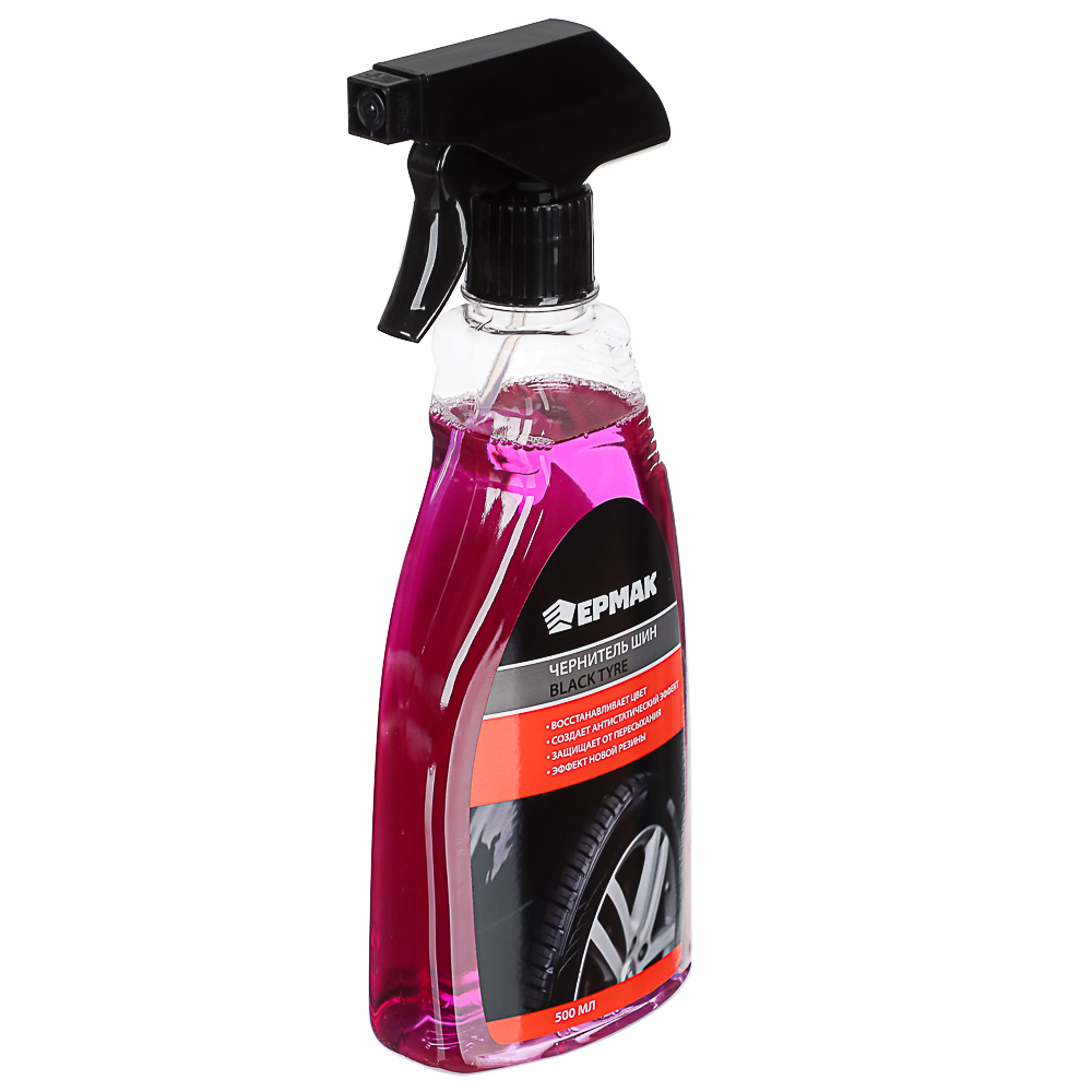 Чернитель шин восстанавливает внешний вид покрышек и других резиновых элементов автомобиля. Возвращает глубокий черный цвет, обновляет внешний вид, придает глянцевый блеск. Создаваемая защитная плёнка обладает антистатическими свойствами, защищает от пыли и УФ-излучения.
