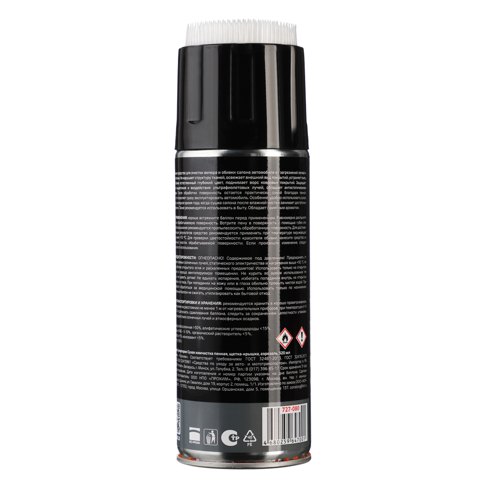 Эффективное средство для очистки обивки салона автомобиля от легкой и средней степени загрязнения. Не нарушая фактуру, освежает внешний вид покрытий, удаляет пыль, возвращает обивке естественный цвет и яркость, поднимает ворс ковровых покрытий. Придает обработанной поверхности антистатические свойства. Пенная формула состава оставляет обработанную поверхность практически сухой. Щетка крышка облегчает процесс обработки загрязнений.