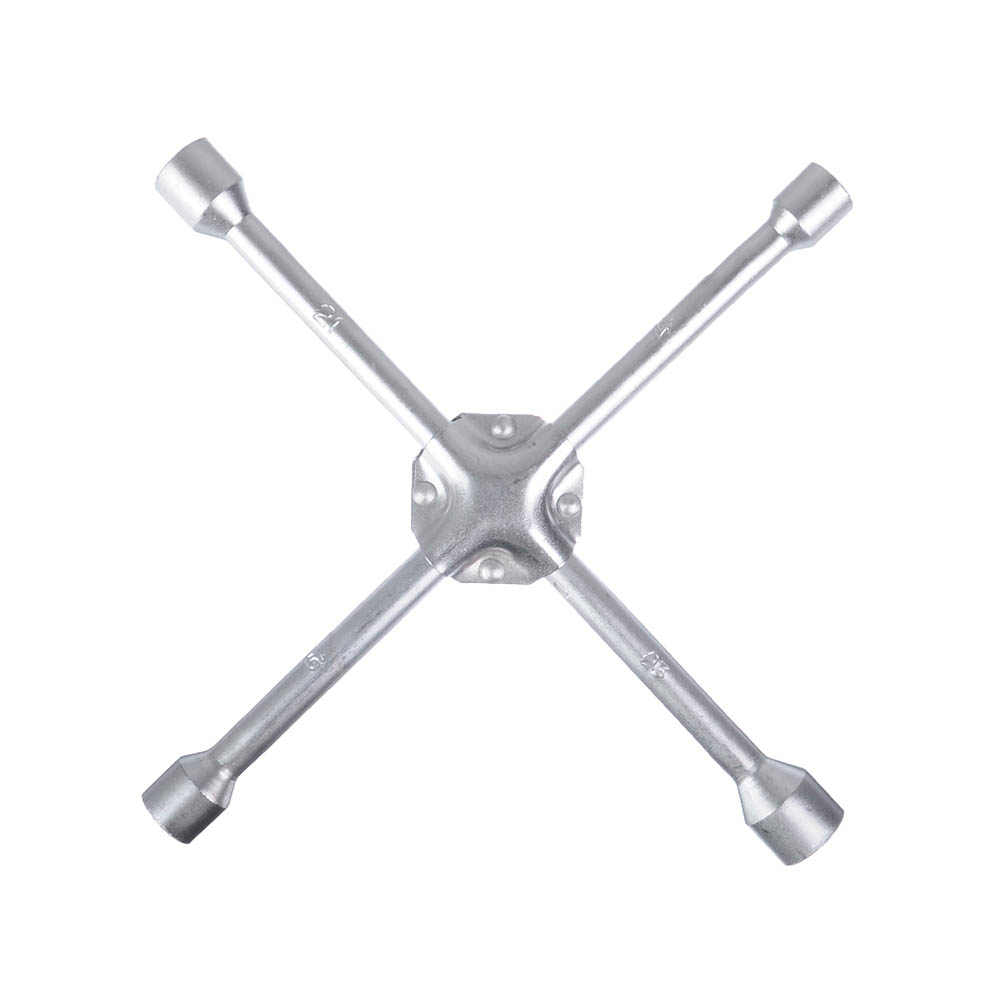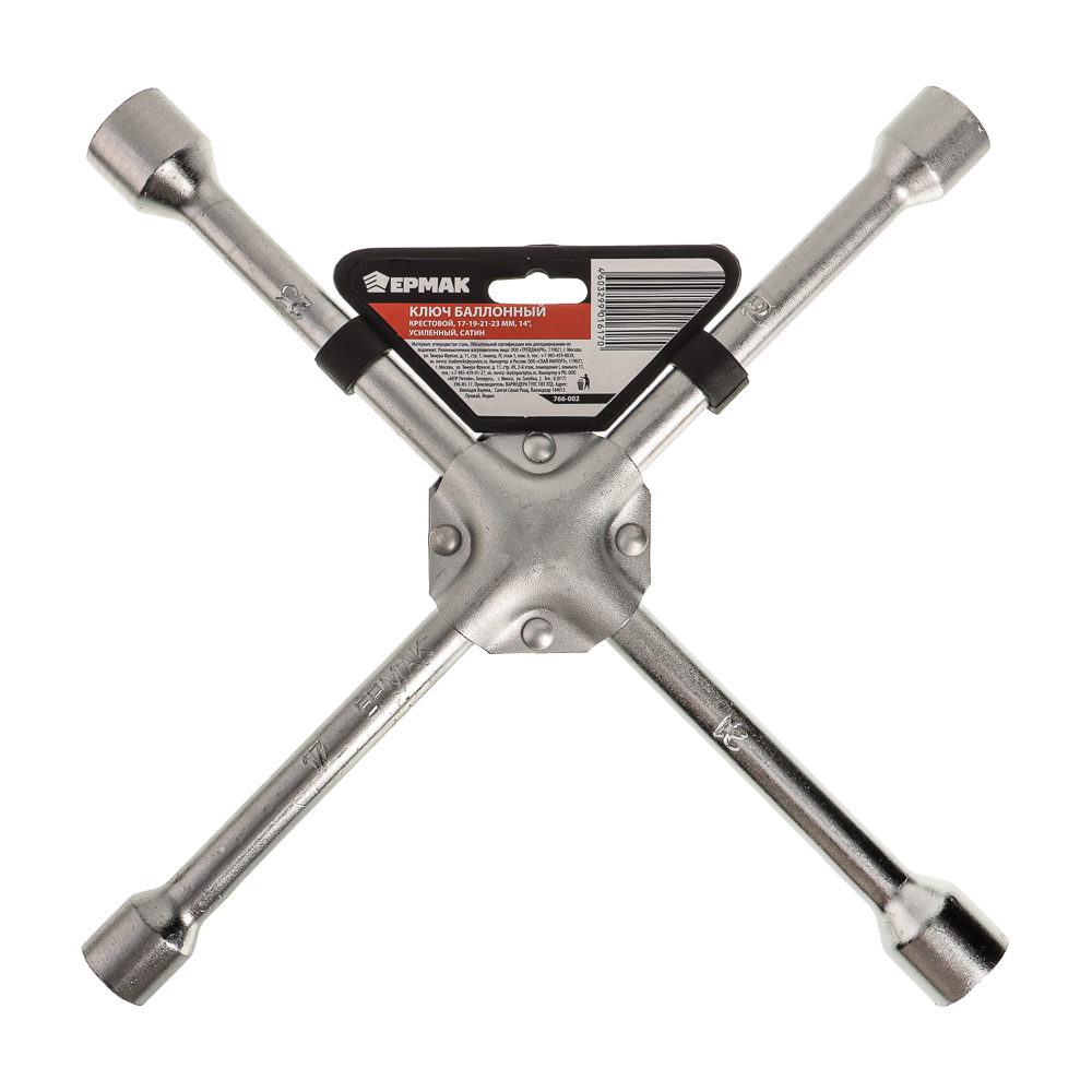 ЕРМАК Ключ баллонный крестовой 14",17x19x21x23 мм, усиленный, сатин- это инструмент, который обязательно должен быть у водителя на случай вынужденной смены колеса в дороге. Также ключ применяется в автомастерских. Инструмент выполнен из прочной стали, имеет крестообразную форму.