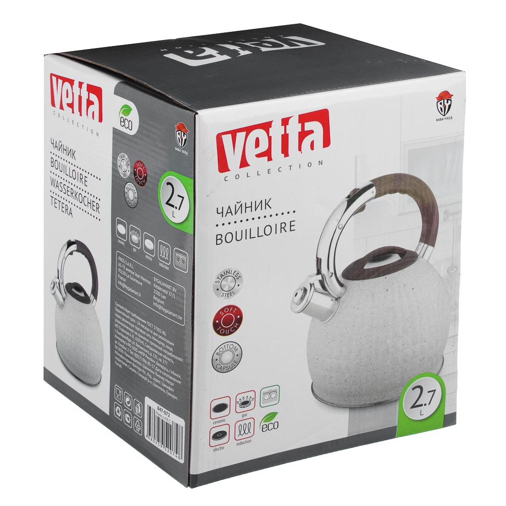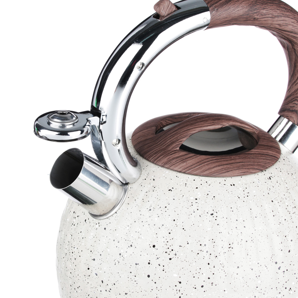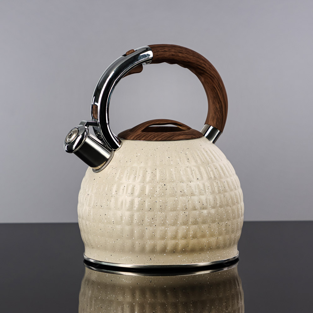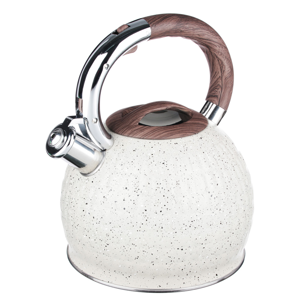 Чайник стальной VETTA "Светлый гранит" 2,7 л — современное решение для вашей кухни. Объём 2,7 л идеален для большой семьи или приёма гостей. Чайник выполнен из нержавеющей стали марки 201 с индукционным дном из стали 430, что гарантирует быстрый и равномерный нагрев на всех типах плит, включая индукционные. Функциональный клапан свистка открывается нажатием на ручку, обеспечивая безопасное использование. Эргономичная ручка с покрытием софт-тач не нагревается и удобно лежит в руке. Чайник можно мыть в посудомоечной машине. Спокойный цвет и лаконичный дизайн впишутся в интерьер любой кухни.