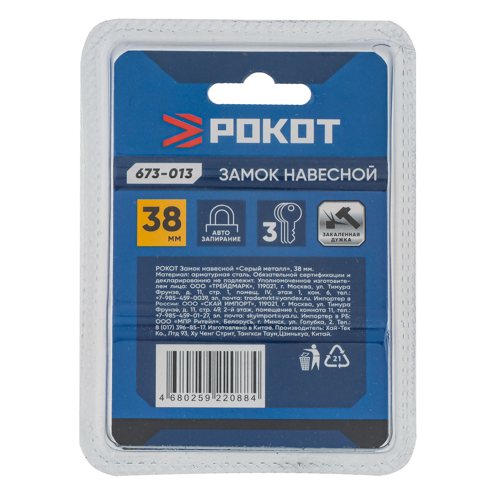 Навесные замки торговой марки РОКОТ- это надежный защитник любого помещения.Сложная конструкция замка повышает стойкость к взлому, а закаленная дужка снижает вероятность её распила. Корпус изготовлен из чугуна, что гарантирует долгий срок службы.Замок запирается автоматически, при нажатии на дужку без использования ключа