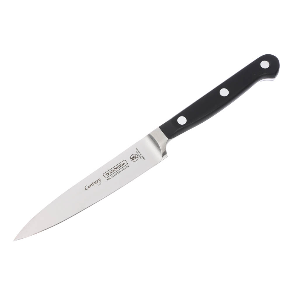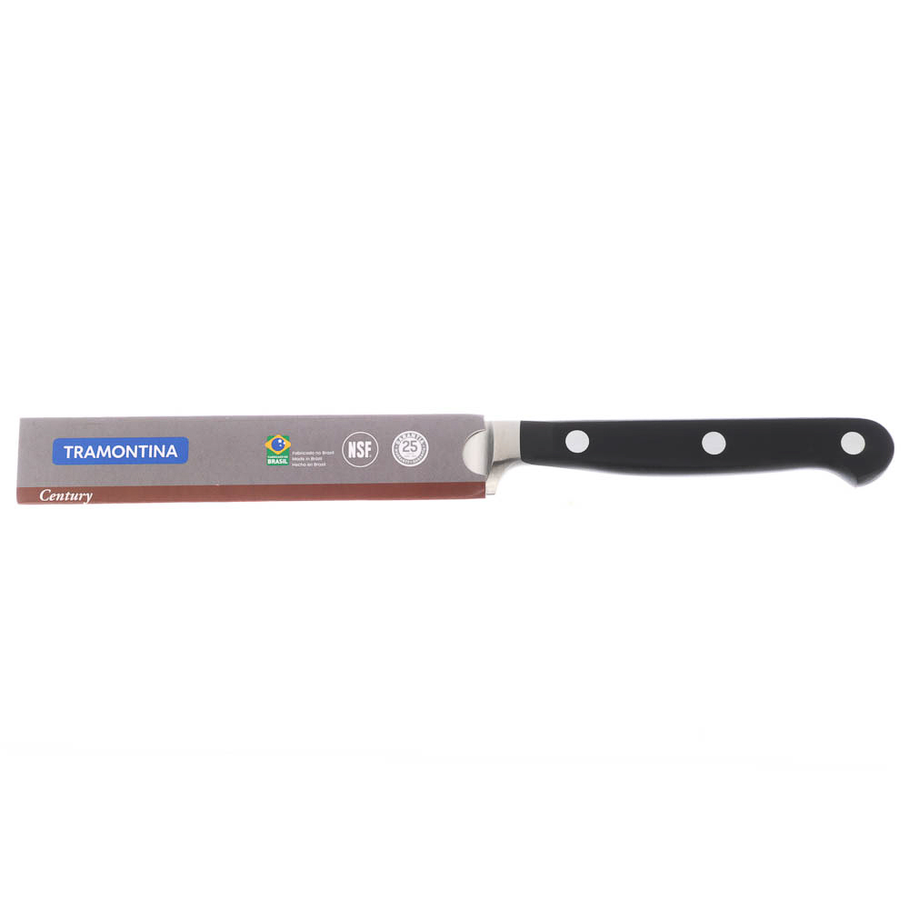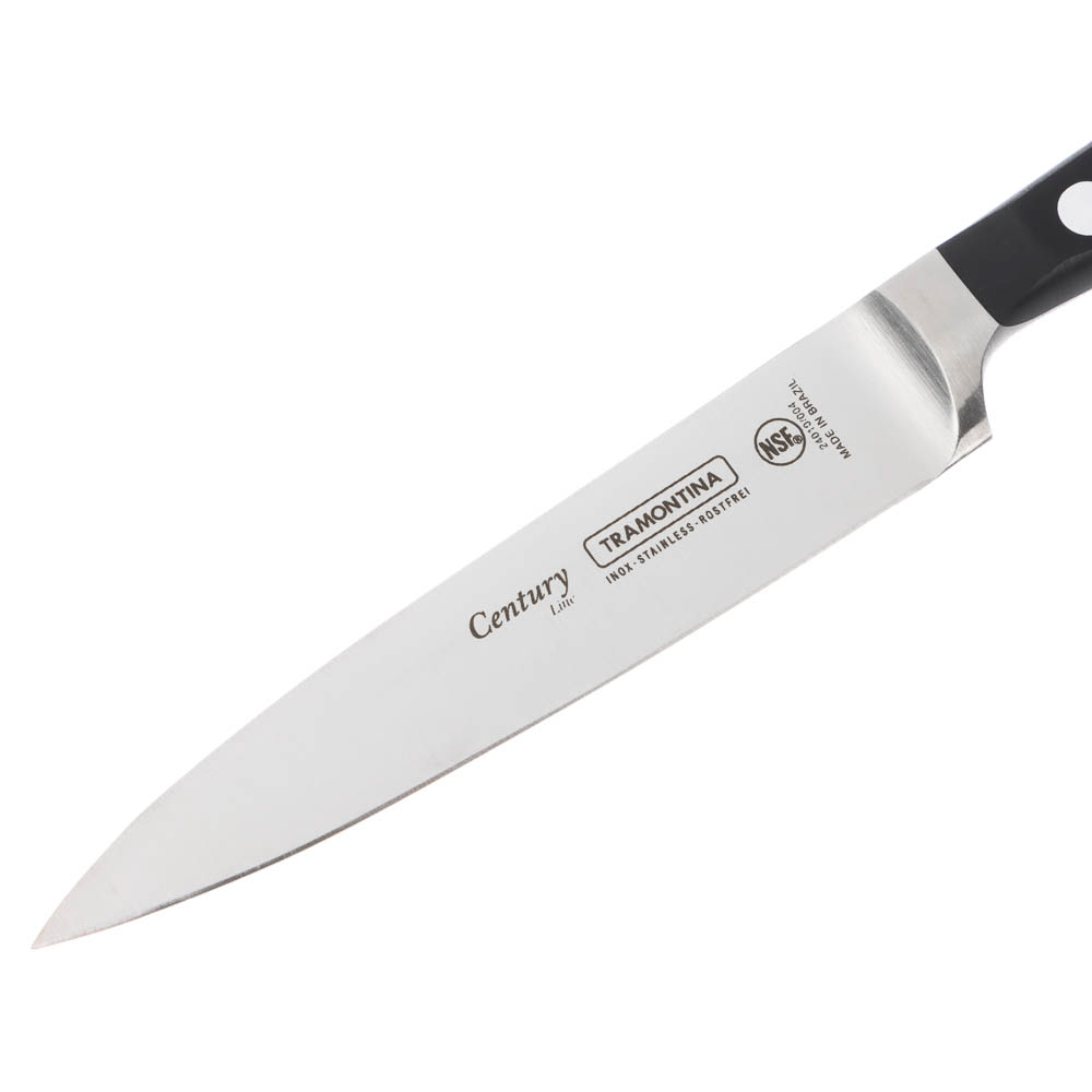 Кухонный нож Tramontina Century — универсальная модель, предназначенная для качественной и быстрой нарезки любых продуктов. Длина лезвия — 10,16 см, ширина — 2 см. Долго остается острым. Не ржавеет и не окисляется. Не абсорбирует запахи. С ним вы будете себя чувствовать на кухне, как профессиональный шеф-повар. 7 причин купить кухонные ножи Tramontina Century 24010/004:• создан для ежедневных больших нагрузок• кованое лезвие прошло три вида закалывания • нержавеющая сталь DIN 1.4110, уровень твердости 54/58 (у алмаза — 67)• рукоятка выполнена из поликарбоната и укреплена стекловолокном
