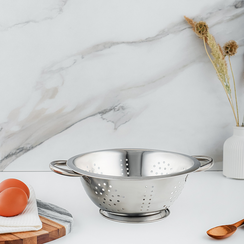 Дуршлаг на ножке из нержавеющей стали диаметром 22 см поможет слить консервированные продукты, промыть крупы и ягоды. Незаменимый помощник во время приготовления картофеля и макаронных изделий. Нержавеющая сталь не подвержена коррозии, поэтому изделие прослужит много лет. Плоское дно обеспечивает устойчивость. Две удобные ручки по бокам позволяют комфортно переносить дуршлаг, не обжигаясь и не повреждая готовые продукты.Дуршлаг VETTA "Классика" станет отличным дополнением к инвентарю любой хозяйки, позволяя с легкостью и комфортом приготовить самые разнообразные блюда.