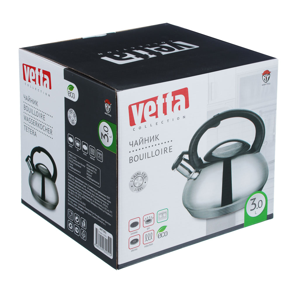 В поиске идеального чайника? Vetta Франсуа станет вашим любимчиком с первой встречи. Благодаря капсульному дну, вода нагревается быстрее, экономя ресурсы и ваше время. Свисток не позволит забыть о чайнике на плите. Не нагревающаяся ручка не позволит обжечься. Трехлитровая емкость позволяет приготовить 6 стандартных кружек чая для членов семьи и друзей. 6 причин купить чайник из нержавеющей стали Vetta Франсуа:• объем 3 литра — идеально для большой семьи; • капсульное дно обеспечивает быстрый равномерный нагрев;• материал — нержавеющая сталь;• подходит для всех типов плит, включая индукционную;• свисток сообщает, что пришло время пить чай;• покрытие ручки не нагревается, исключая ожоги.