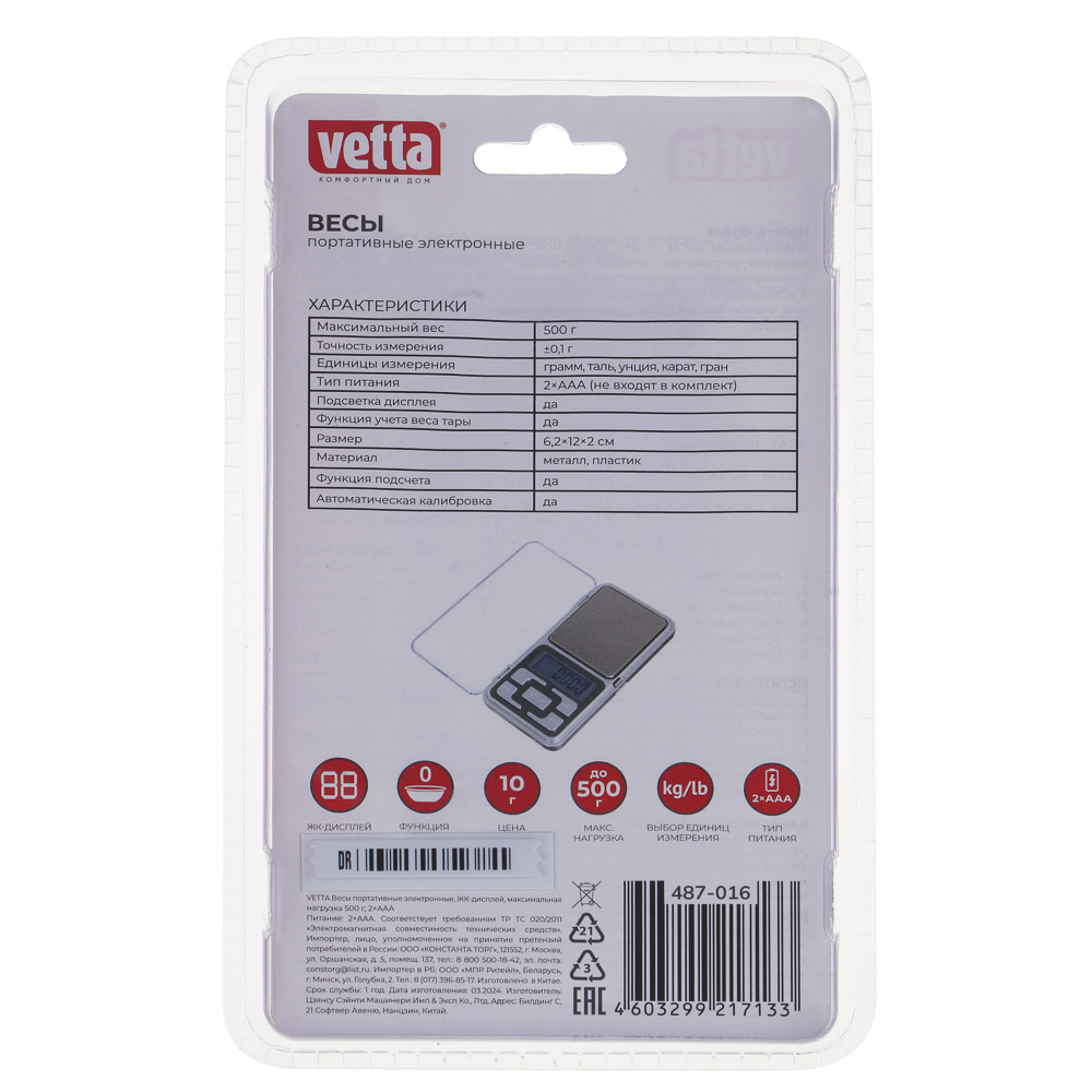 Весы портативные электронные VETTA станут незаменимым помощником в любом хозяйстве. Максимальная нагрузка до 500 г позволяет взвешивать как крупные, так и мелкие предметы с максимальной точностью. ЖК-дисплей с подсветкой обеспечивает удобное чтение показаний даже при недостаточном освещении. Легко взвешивайте содержимое, исключая вес контейнера, благодаря функции учета тары. Имеют полезную функция подсчета мелких предметов, таких как монеты или бусины. Автоматическая калибровка обеспечивает точные результаты взвешивания каждый раз, избавляя вас от необходимости ручной настройки. Работают от двух батареек типа ААА (в комплект не входят), что делает весы мобильными и удобными в использовании в любом месте.