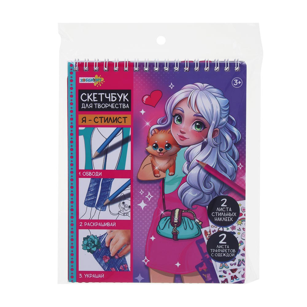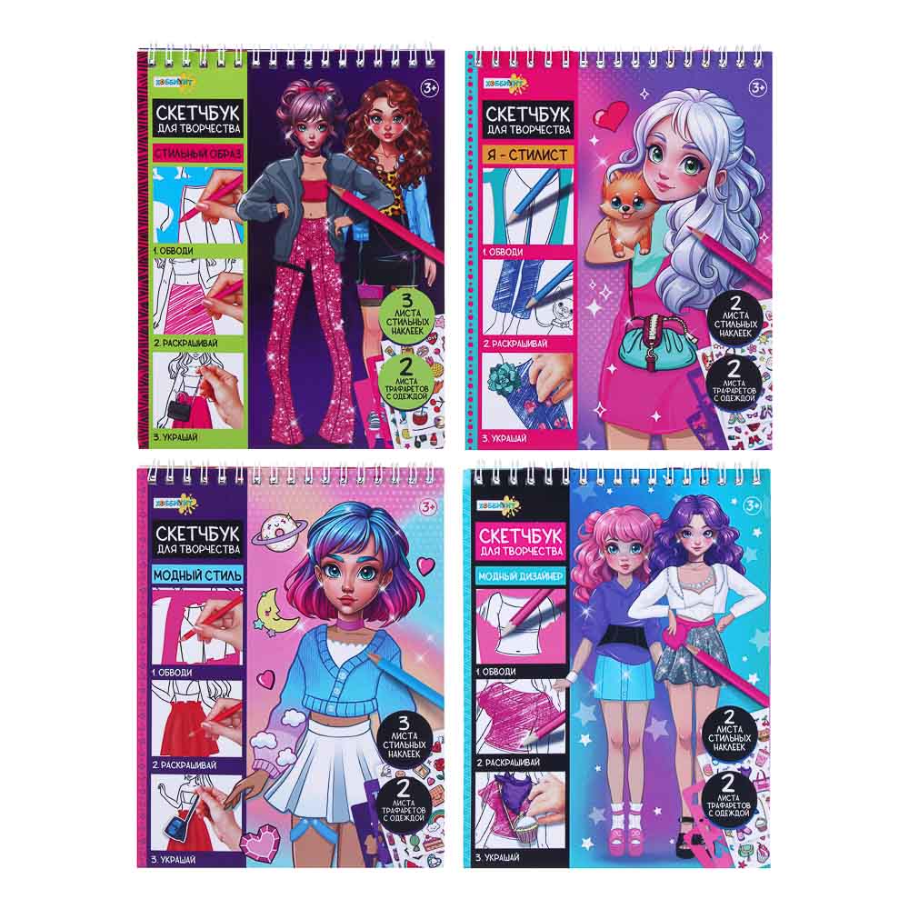 Скетчбук для творчества от Хоббихит - это тетрадь, в которой создают модные коллекции одежды и образы. В комплекте трафареты одежды и наклейки. Трафареты накладывают на модели, обводят и раскрашивают. Одежду декорируют наклейками. Объем скетчбука - 20 листов. Материал - картон, трафареты из пластика. Удобный размер - 15 х 19 см: меньше размера обычной тетради, скетчбук удобно брать с собой в поездки или в гости к подругам, чтобы заниматься творчеством в любом месте. На выбор 4 варианта скетчбуков с разными моделями, наклейками и одеждой. Для детей от 3 лет. Купите в подарок для девочки!