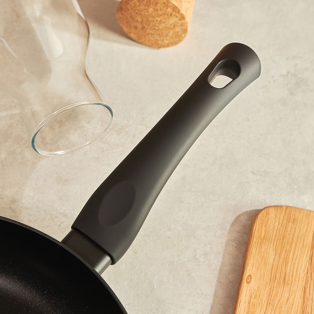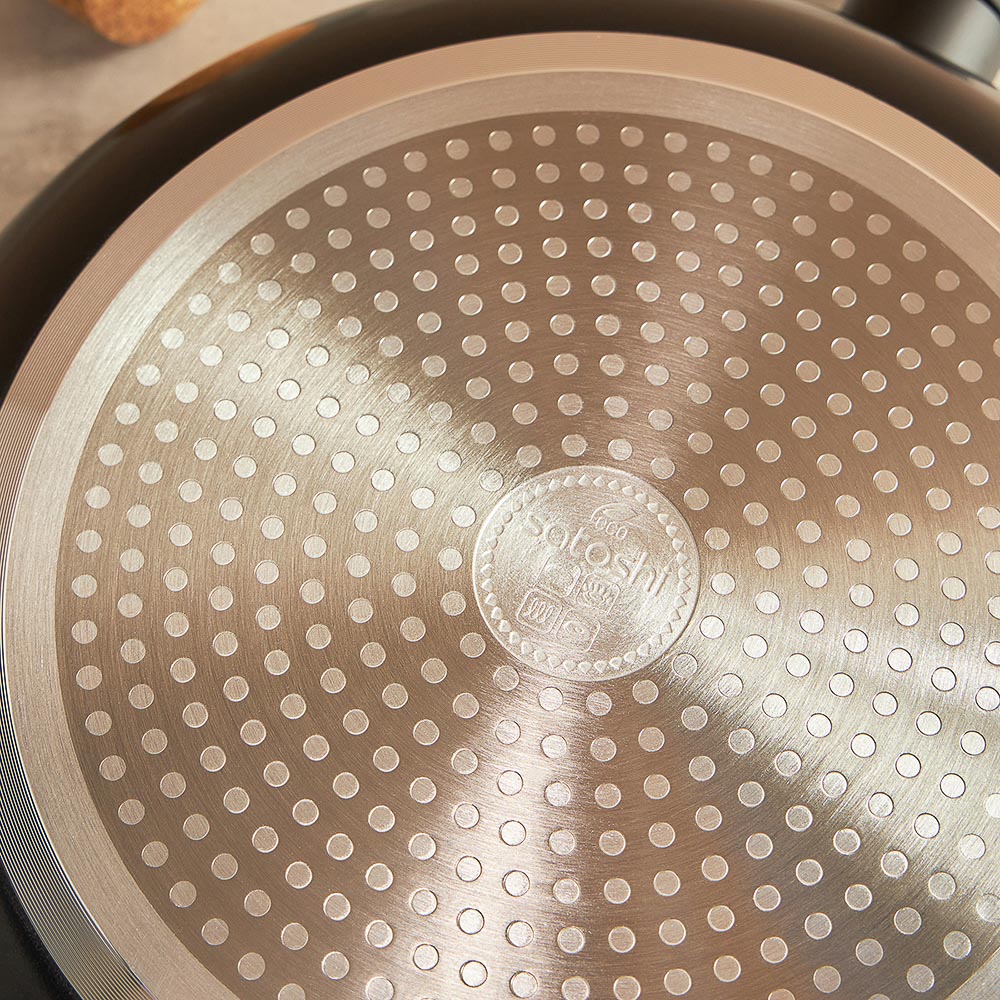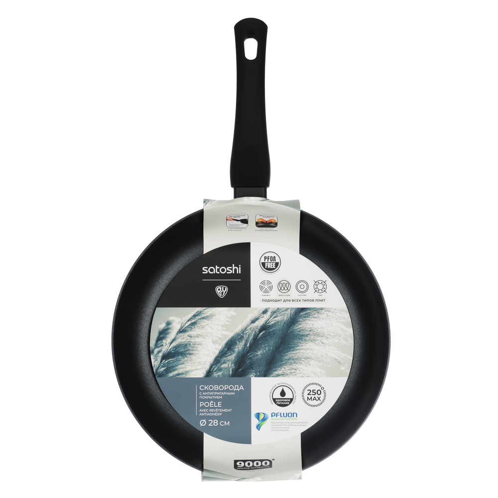 Быстро прогревается. К ней никогда не прилипает еда. Сковорода SATOSHI заставит вас полюбить готовку, даже если до этого вы ели только полуфабрикаты. Готовьте традиционные блюда с душой, как это делали наши бабушки. Курица с рисом, жаренная картошка, котлеты, рагу — ни одно блюдо не прилипает к посуде. Прекрасная помощница на каждой кухне. 5 причин купить сковороду SATOSHI Графит диаметром 28 см:Индукционное дно для всех видов варочных панелей.Штампованный алюминий быстро нагревается, ускоряя жарку продуктов.Не содержит токсических веществ PFOA и PTFE.Эргономичная ручка из бакелита с силиконовым напылением, не нагревается.Можно мыть в посудомоечной машине.