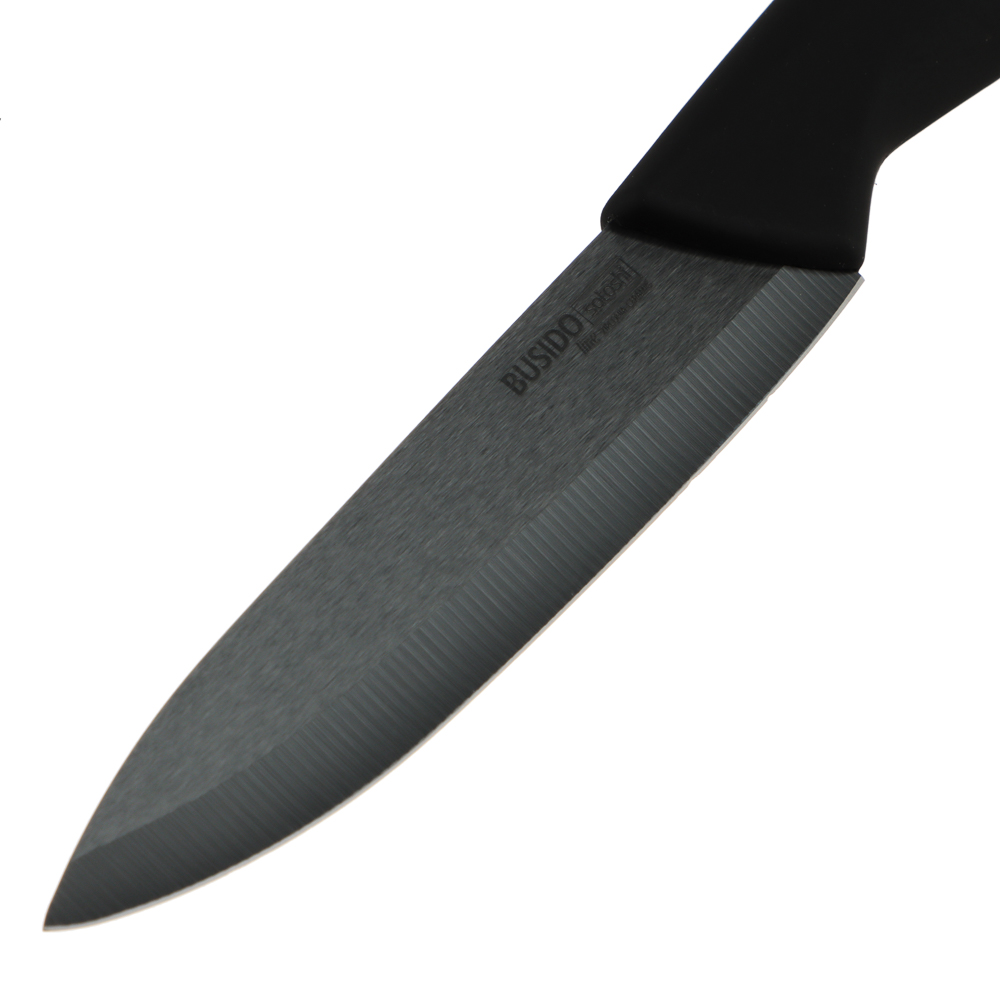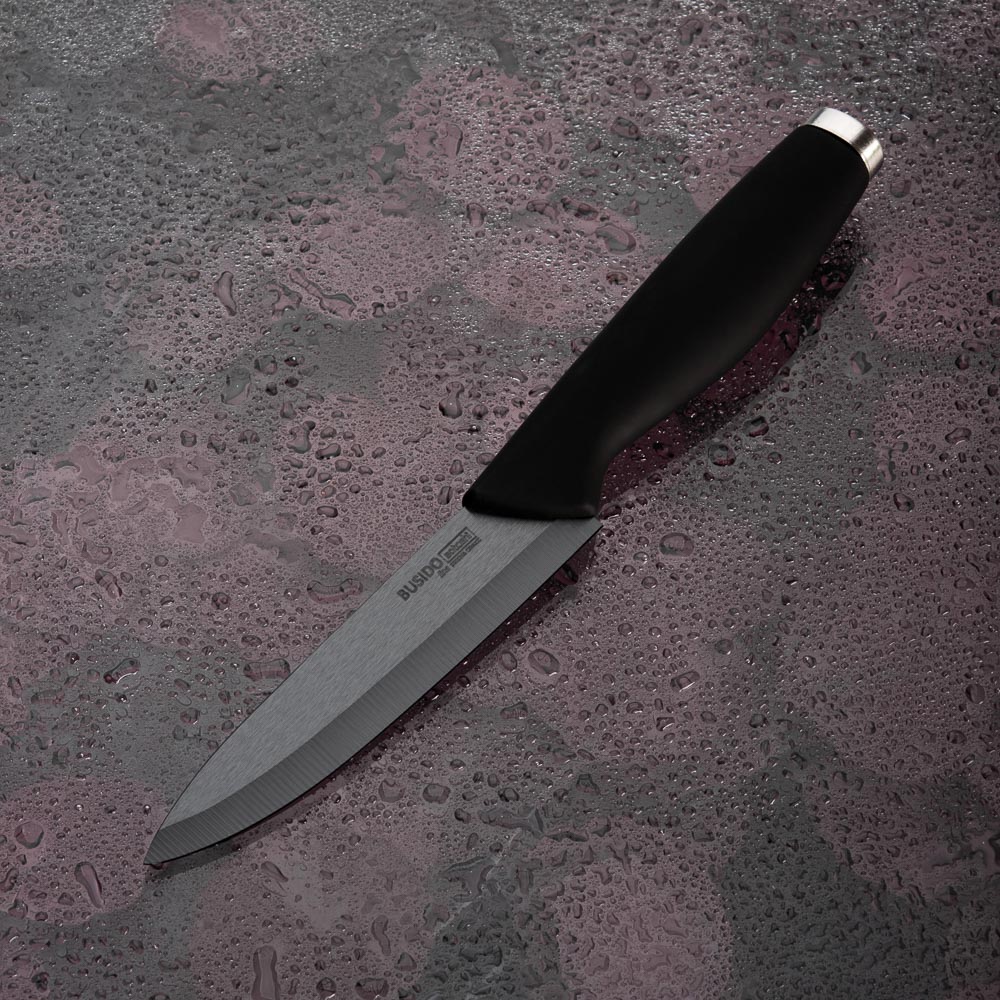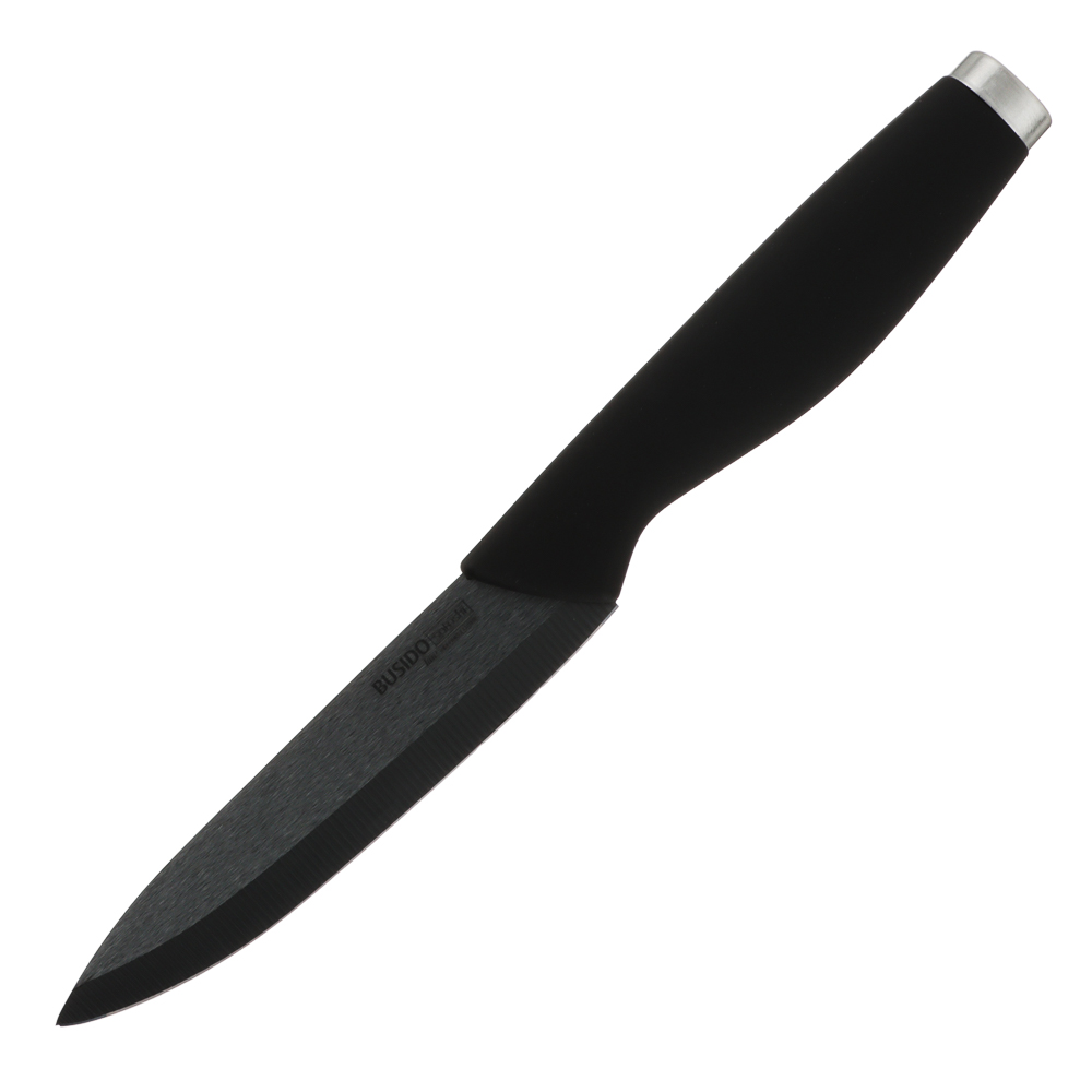 Керамический кухонный нож 12,5 см SATOSHI Бусидо удивит вас удобством и точностью нарезки. Керамическое лезвие не нуждается в частой заточке. Материал не вступает в реакцию со щелочами и кислотами, не боится ржавчины и надолго сохраняет опрятный внешний вид. Керамический кухонный нож порадует отличной остротой и качеством работы. Изделие не придает продуктам металлического привкуса и легко затачивается камнем с алмазным напылением. Эргономичная рукоятка удобно ложится в руке и обеспечивает комфортное использование аксессуара. В комплекте предоставляется защитный чехол для безопасного хранения и транспортировки ножа.