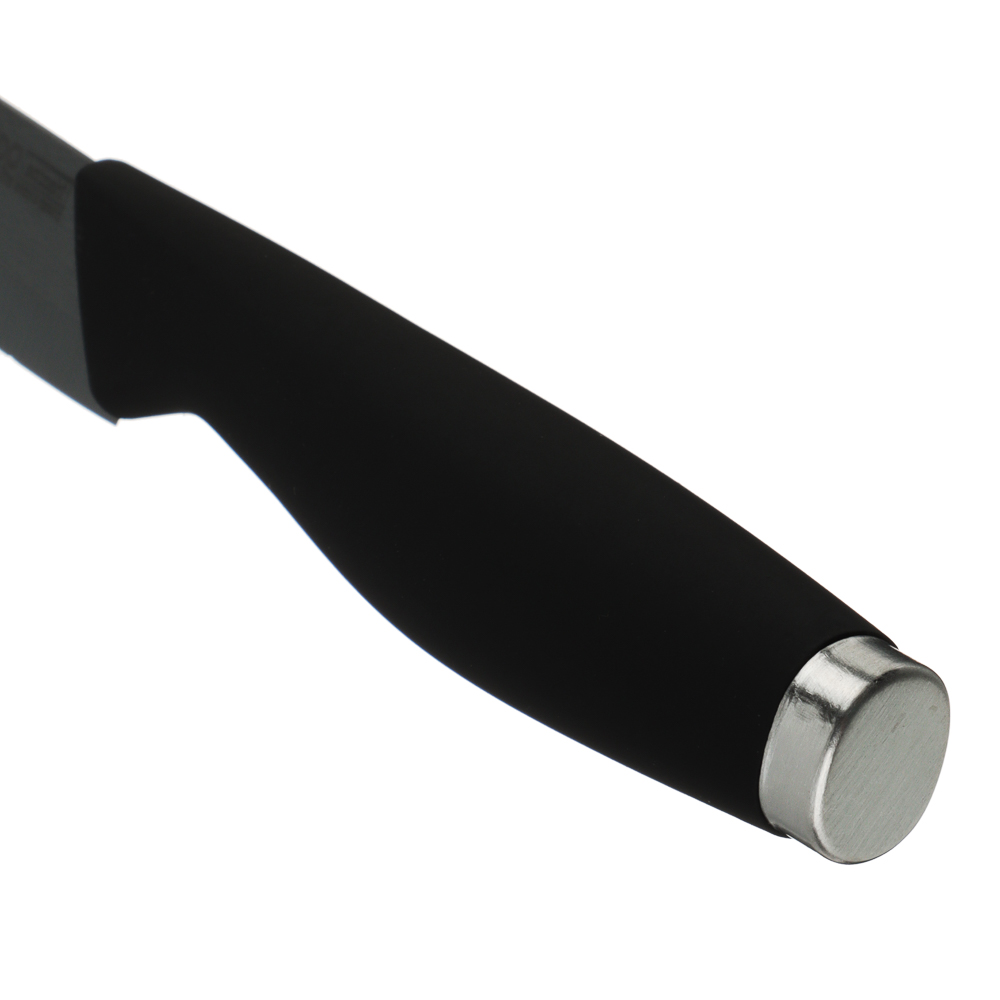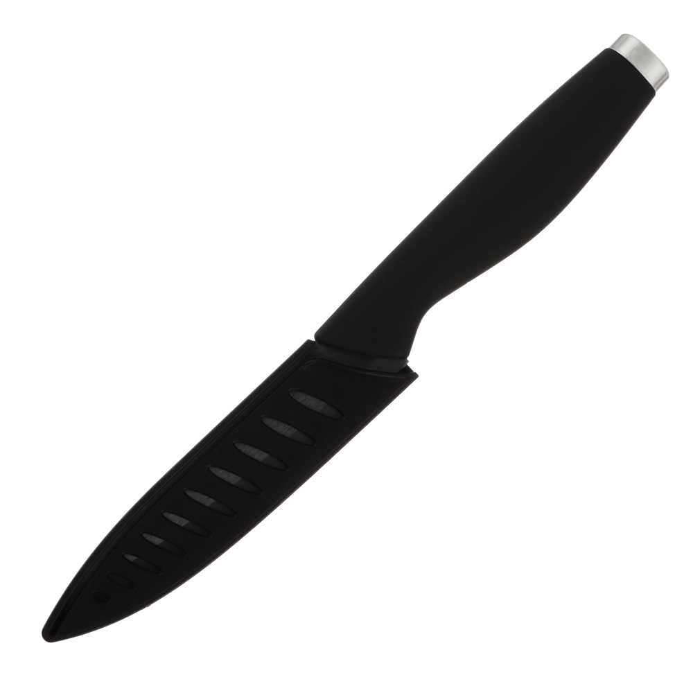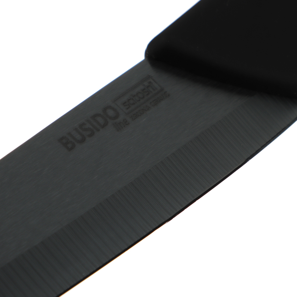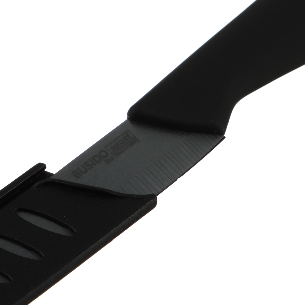 Керамический кухонный нож 12,5 см SATOSHI Бусидо удивит вас удобством и точностью нарезки. Керамическое лезвие не нуждается в частой заточке. Материал не вступает в реакцию со щелочами и кислотами, не боится ржавчины и надолго сохраняет опрятный внешний вид. Керамический кухонный нож порадует отличной остротой и качеством работы. Изделие не придает продуктам металлического привкуса и легко затачивается камнем с алмазным напылением. Эргономичная рукоятка удобно ложится в руке и обеспечивает комфортное использование аксессуара. В комплекте предоставляется защитный чехол для безопасного хранения и транспортировки ножа.