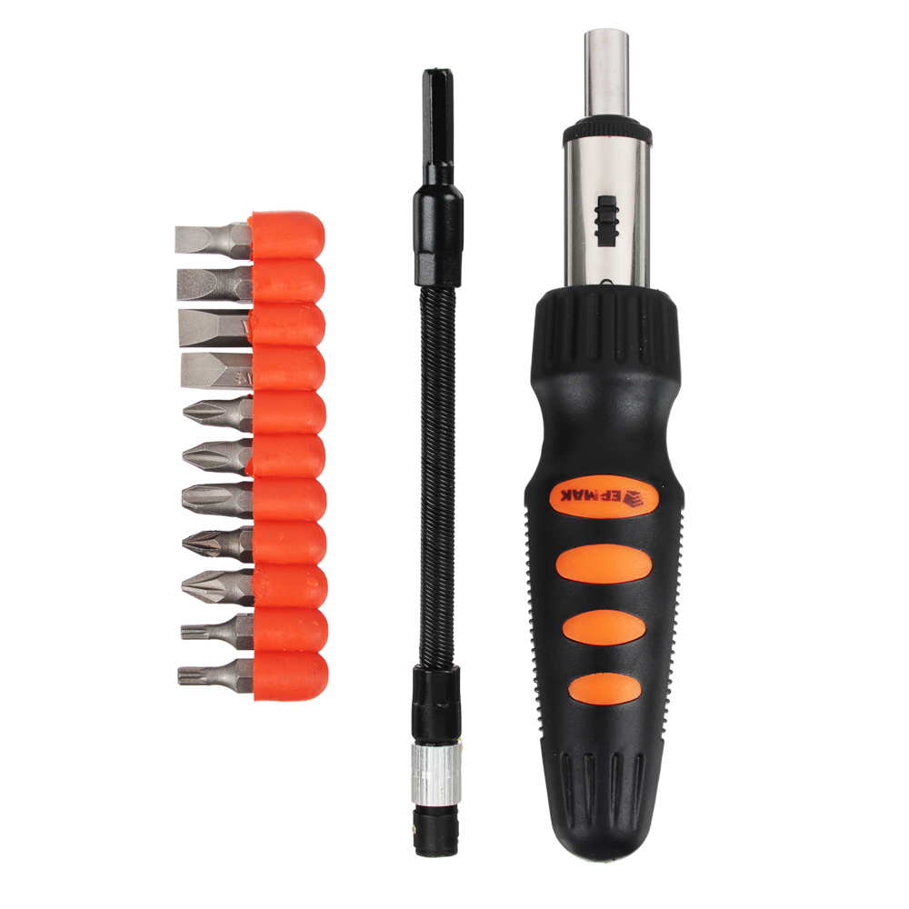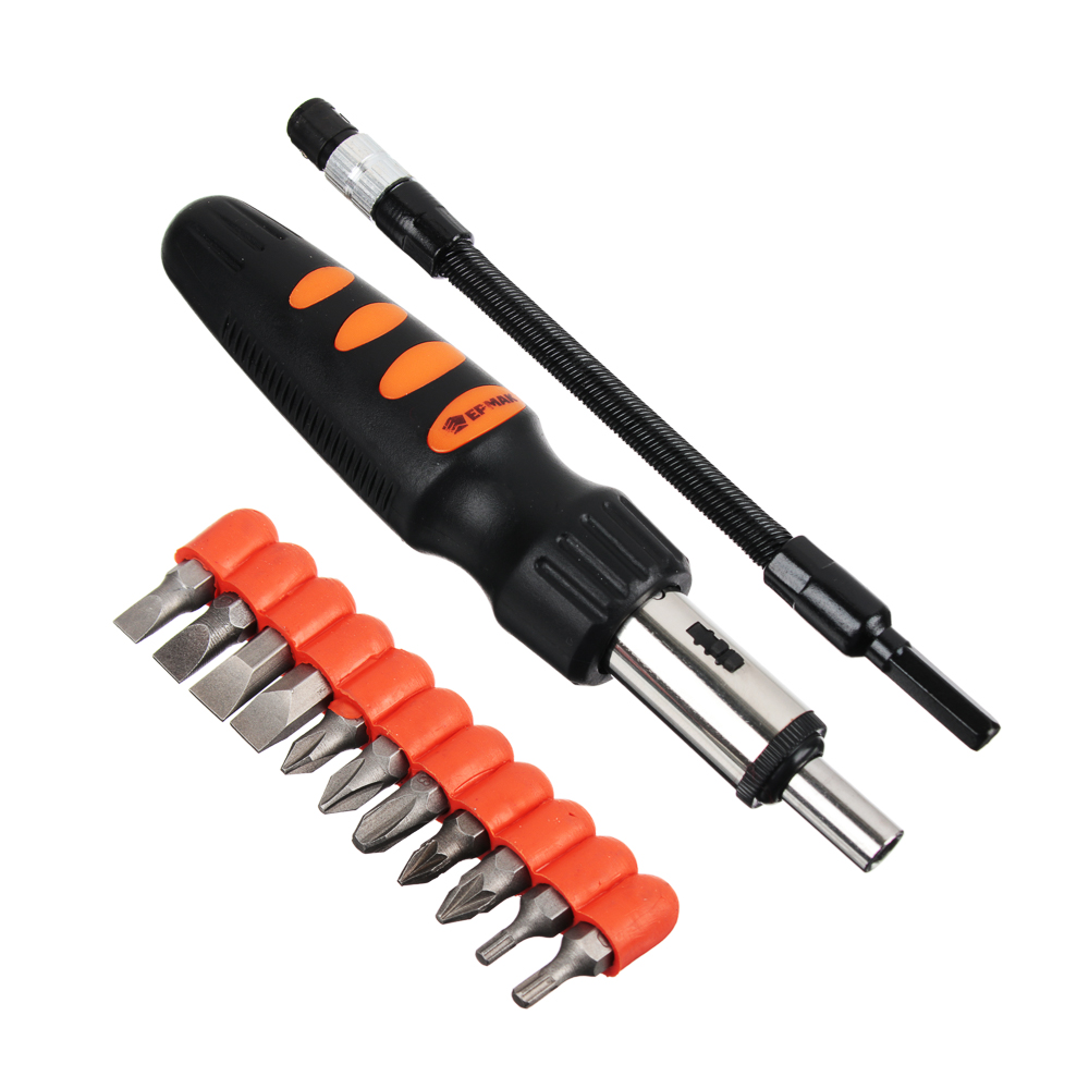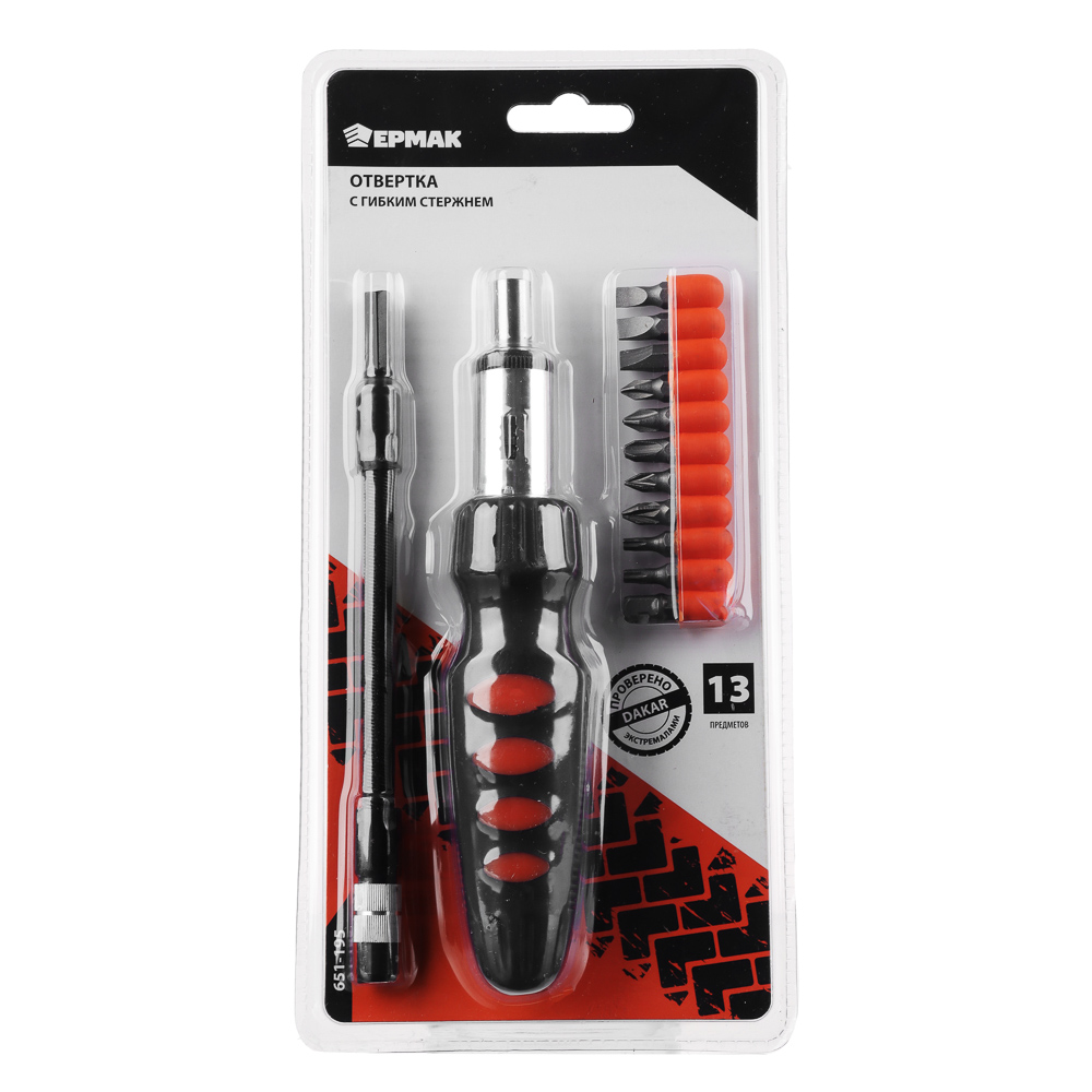 Отвертка Ермак с гибким стержнем. Ее используют, когда нужно добраться до крепления под углом и в труднодоступных местах. В комплекте 10 бит разного типоразмера: для крепежей с крестовым шлицем PH1, PH2, PH3, для крепежей с прямым шлицем SL5, SL6, SL7, для крепежей со шлицем с дополнительными насечками PZ1, PZ2, для крепежей со шлицем TORX T15, T20. Магнитный держатель для бит. Адаптер 1/4.Состав набора: т-образная отвертка с прорезиненной ручкой; прямой шлиц: SL3, SL4, SL5, SL6, SL8; крестовой шлиц: PH1, PH2, PH3; шлиц POZI: PZ1, PZ2, PZ3.