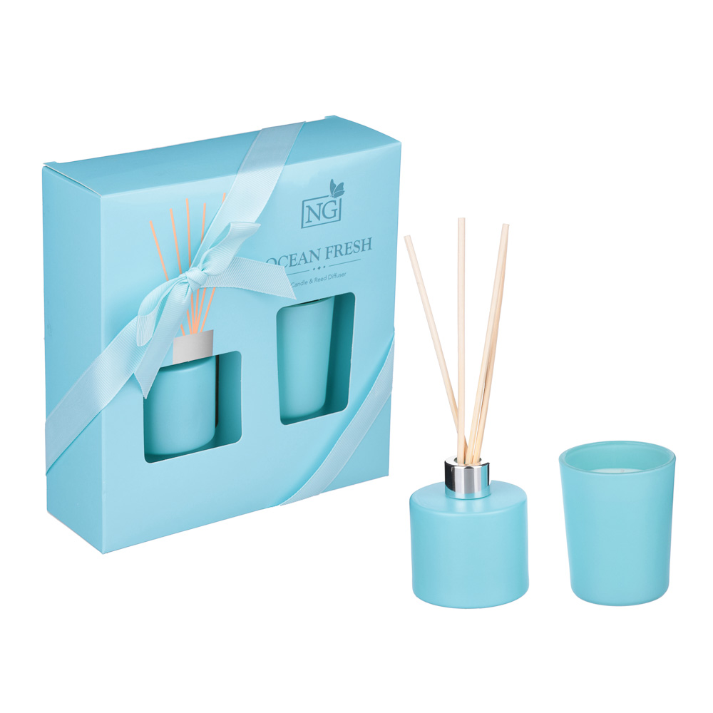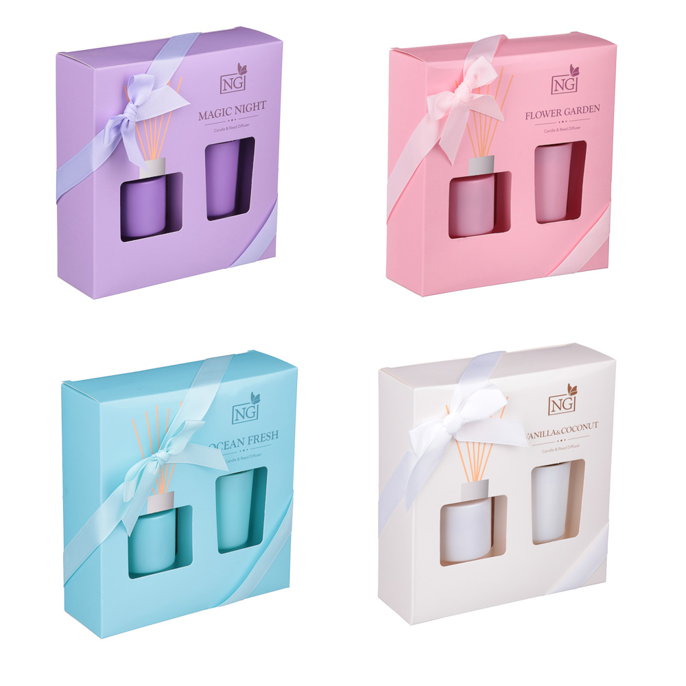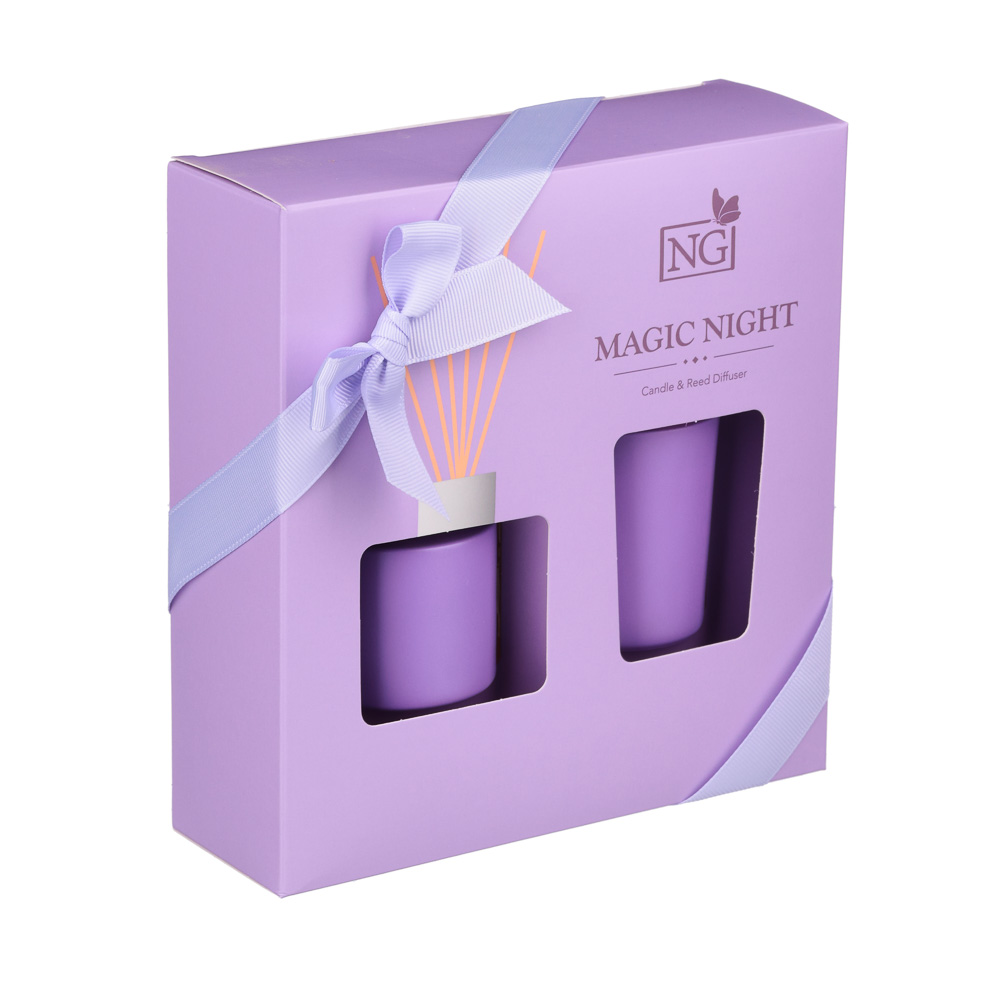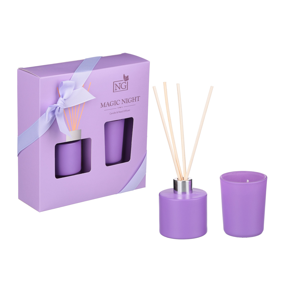 Набор от NEW GALAXY Ароматизатор-диффузор и свеча предназначен для ароматизации жилого помещения. Благодаря своему изысканному дизайну набор будет красиво смотреться в интерьере и может быть использован в создании новогодней композиции. Набор находится в подарочной упаковке, имеет нежные и приятные ароматы, поэтому прекрасно подойдет в качестве подарка для друзей и близких. 4 аромата на выбор.