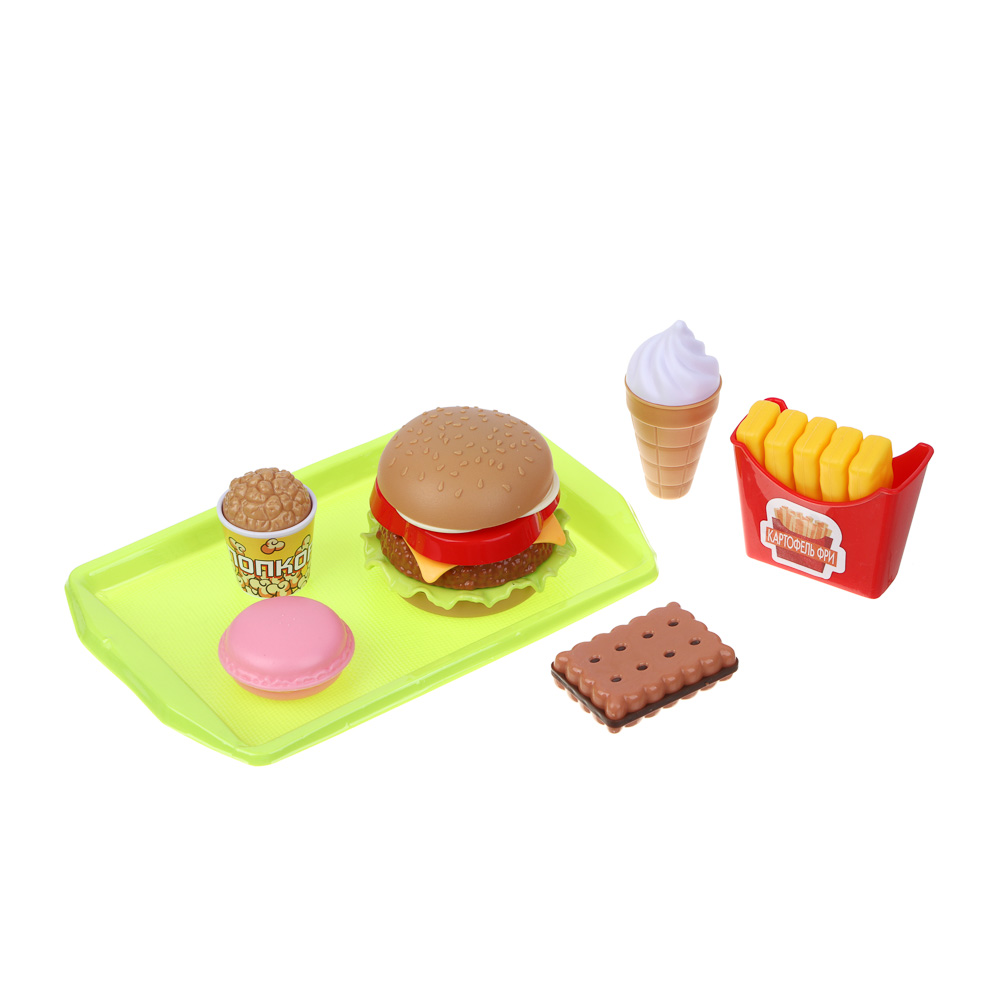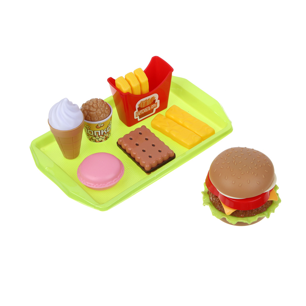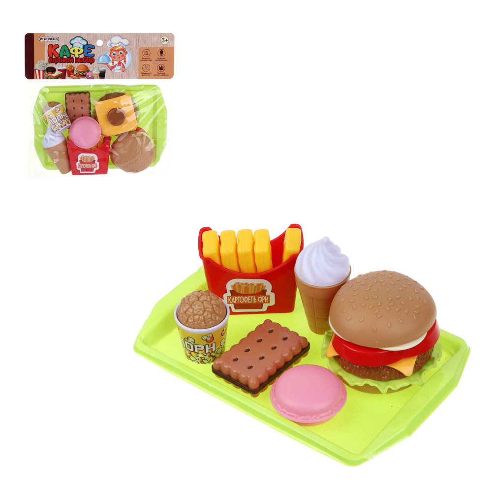 Игровой набор Кафе разнообразит сюжетные игры детей. Теперь маленькие фантазеры смогут открыть свою закусочкою, фаст-фуд или расширить меню в уже имеющемся ресторане высокой кухни. В комплекте 3 продукта. Гамбургер состоит из съемных деталей, которые нужно правильно собрать по принципу конструктора. Картошка Фри вынимается с пакета. Купить игровой набор Кафе рекомендуется детям старше 3-х лет.