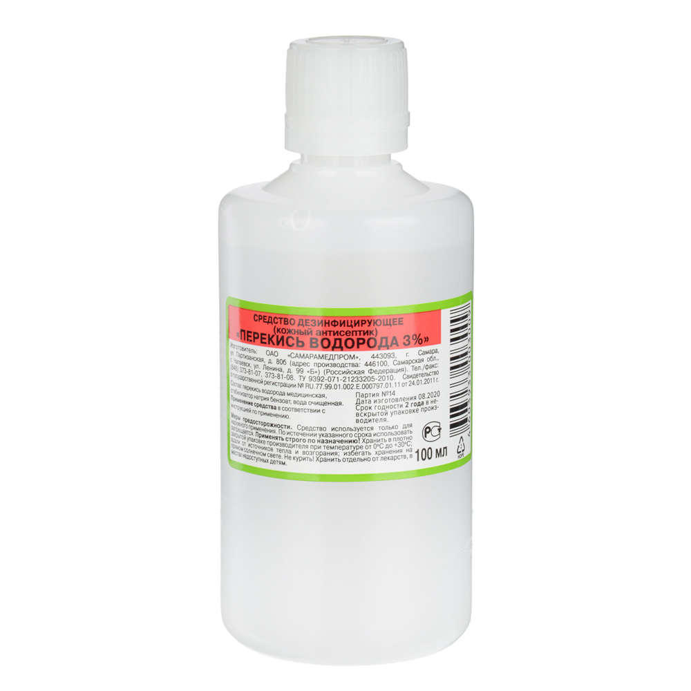 Перекись водорода 3 % – это эффективное дезинфицирующее средство, предназначенное для использования в быту и медицине. Перекись водорода используется для обработки небольших ран, порезов, ссадин, а также для дезинфекции кожных покровов. Она способствует остановке кровотечения и предотвращает инфекционные осложнения. Также средство подходит для обработки инструментов и поверхностей с целью их дезинфекции. Флакон объемом 100 мл удобен для хранения и применения. Купить товар можно, добавив его в корзину.