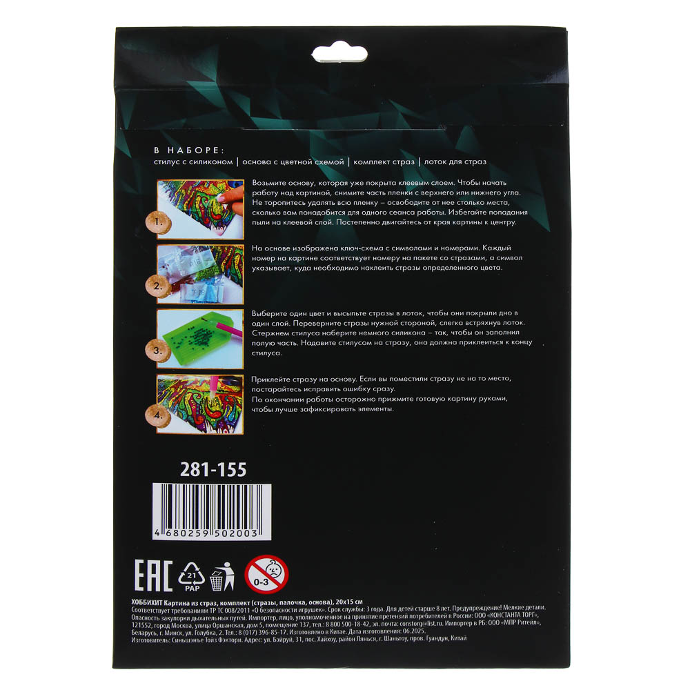 Картина из страз Хоббихит — замечательный подарок творческим детям. Установите холст на подставку и начинайте творить. Главный инструмент юного художника — разноцветные стразы. Выкладывайте яркие камушки специальной ручкой, чтобы получить роскошный шедевр. Купить картины из страз Хоббихит можно в 10-ти дизайнах. Готовая работа станет прекрасным украшением интерьера и памятным презентом родителям.