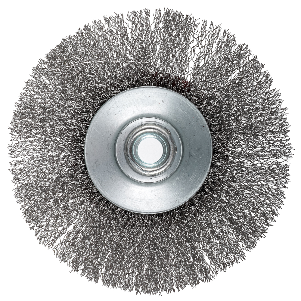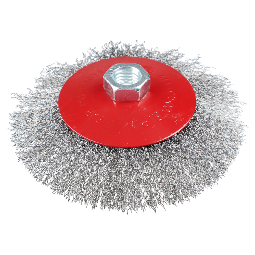 Металлическая щетка для УШМ ЕРМАК «Тарелка» 125мм / М14 с щетиной из стальной проволоки быстро и эффективно удаляет ржавчину с поверхностей, следы старой краски, загрязнения, заусенцы на деталях и заготовках. Дисковая форма идеально подходит для обработки пазов, углов, ниш. Гофрированный ворс долго сохраняет форму, не деформируется. Применяется на УШМ с максимальной производительностью до 125000 об./мин.