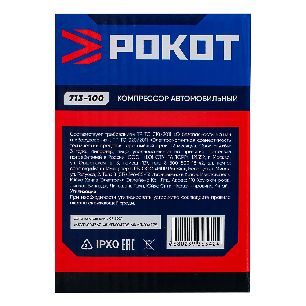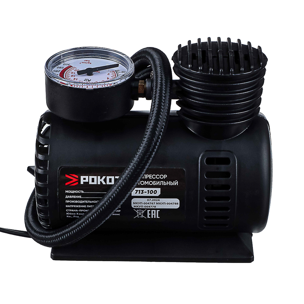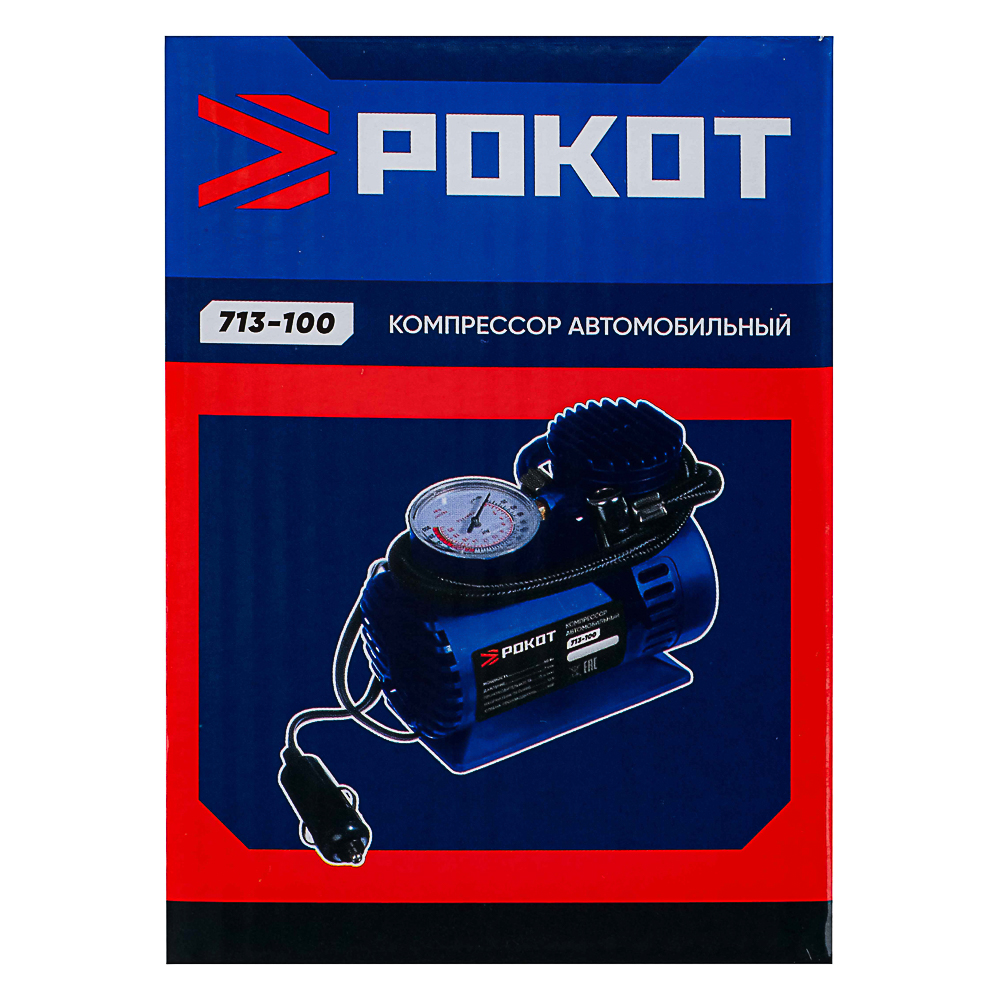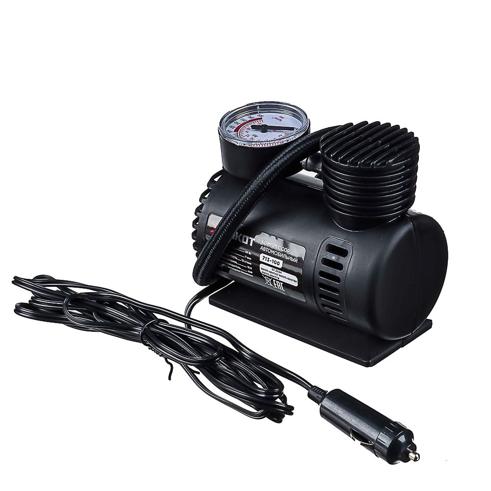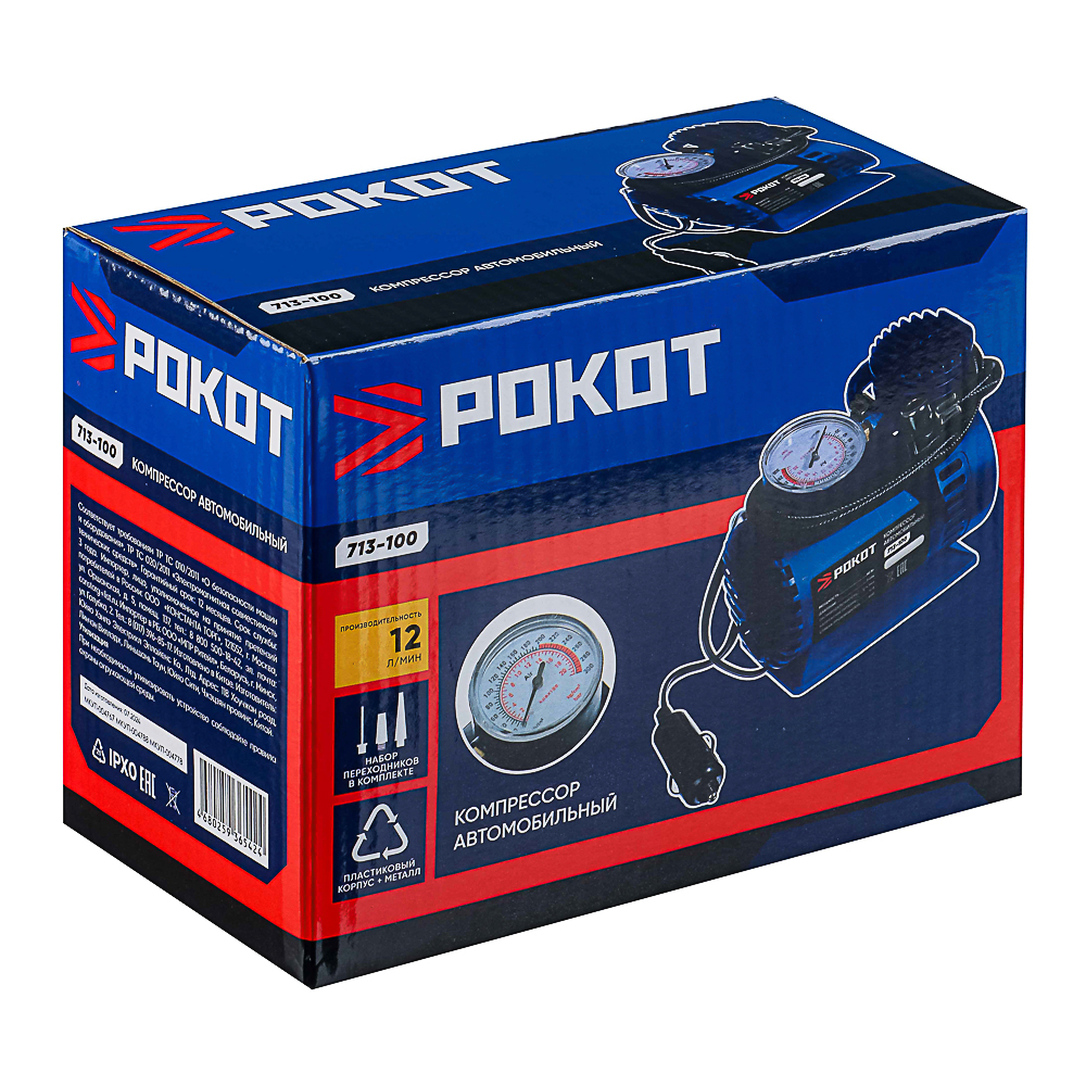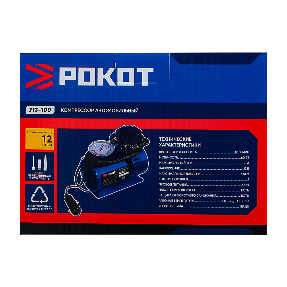 РОКОТ Компрессор автомобильный Цилиндр, 60Вт, 12л/мин, переходники
