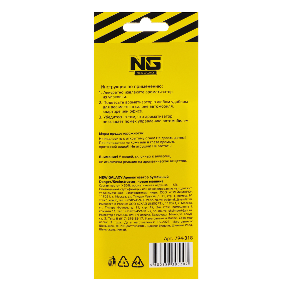 Автомобильный ароматизатор "Danger/Sexinstuctor" с ароматом новая машина выполнен из плотной бумаги и пропитан парфюмированым средством. В обиходе этот вид ароматизаторов еще называют "елочка". Такой освежитель воздуха может располагаться в любом месте машины и обеспечивать в салоне приятный аромат и нейтрализацию посторонних запахов на длительное время.