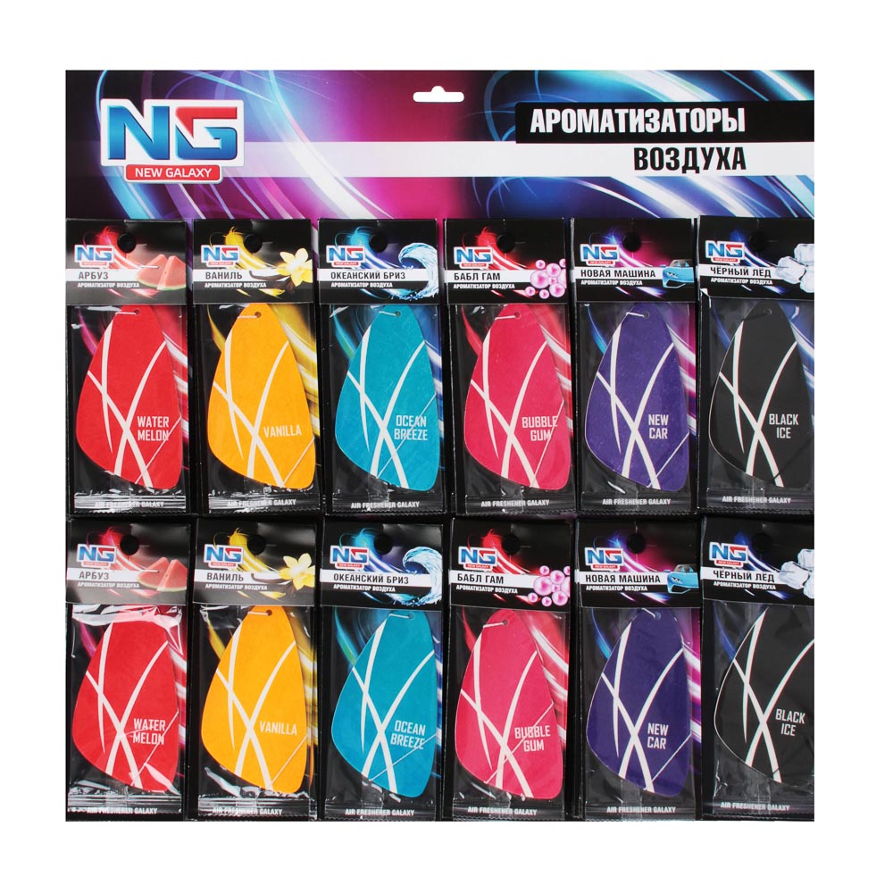 Автомобильный ароматизатор "Galaxy" с миксом ароматов выполнен из плотной бумаги и пропитан парфюмированым средством. В обиходе этот вид ароматизаторов еще называют "елочка". Такой освежитель воздуха может располагаться в любом месте машины и обеспечивать в салоне приятный аромат и нейтрализацию посторонних запахов на длительное время.