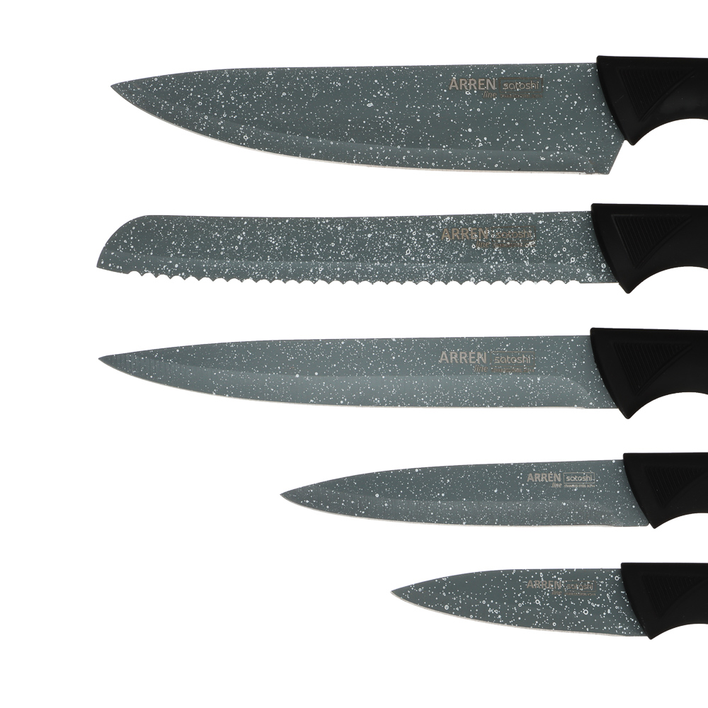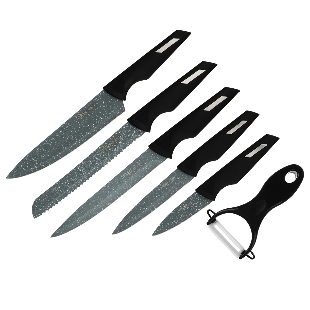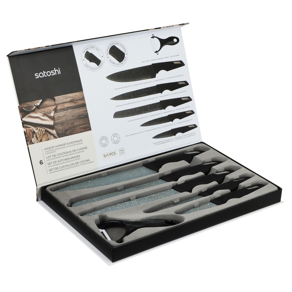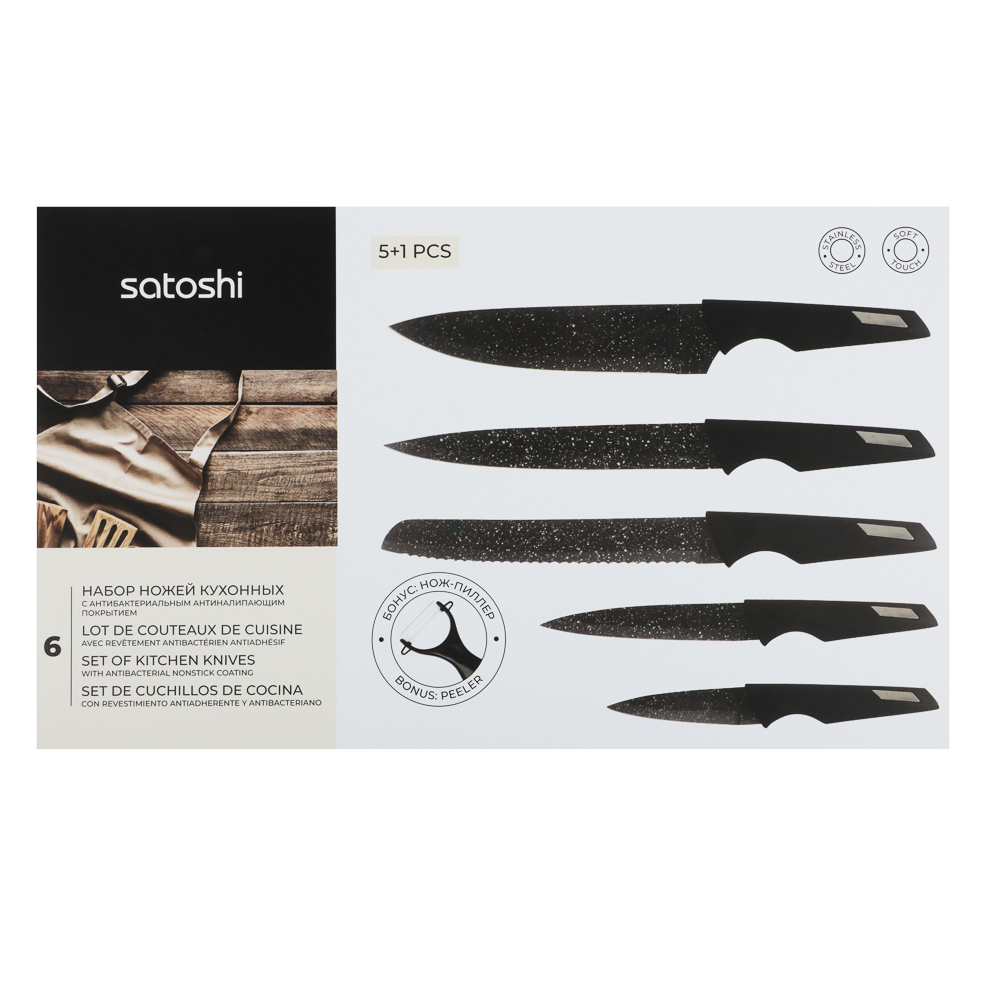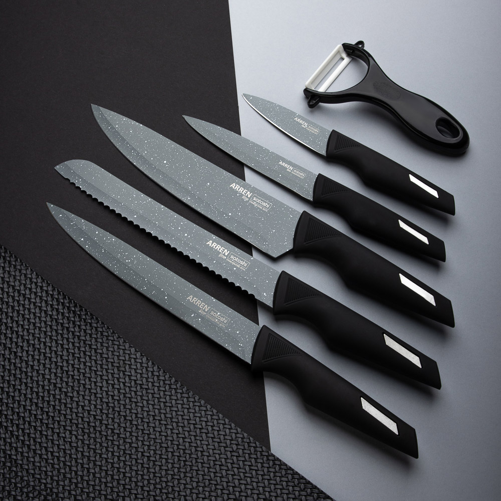 Кухонный набор из 5 ножей с лезвиями из нержавеющей стали и овощечистки — универсальный помощник на кухне. Стальные аксессуары не боятся твердых продуктов и большого давления. Они выдерживают механические повреждения, удары. Кухонный нож из нержавеющей стали не испугаешь температурным шоком и кислыми фруктами. Материал не окисляется и не влияет на вкус продуктов. Идут в комплекте с магнитной коробкой для хранения ножей.