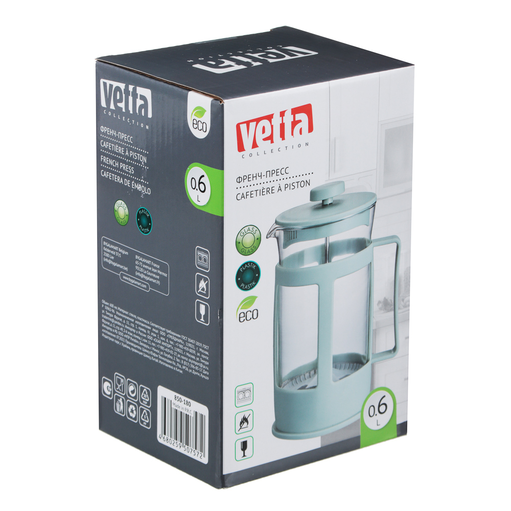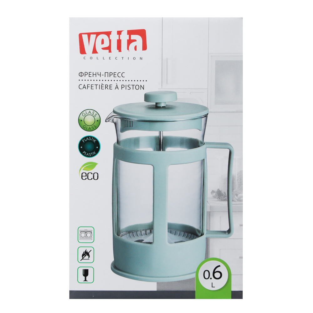 Френч-пресс VETTA Амели объемом 600 мл предназначен для заваривания чая и кофе. Стеклянный френч-пресс имеет пластиковый корпус и надежный пластиковый фильтрующий поршень. Изготовлен из экологически чистых материалов. Удобный носик правильной формы исключает проливание жидкости. Надежный чайник на каждый день!