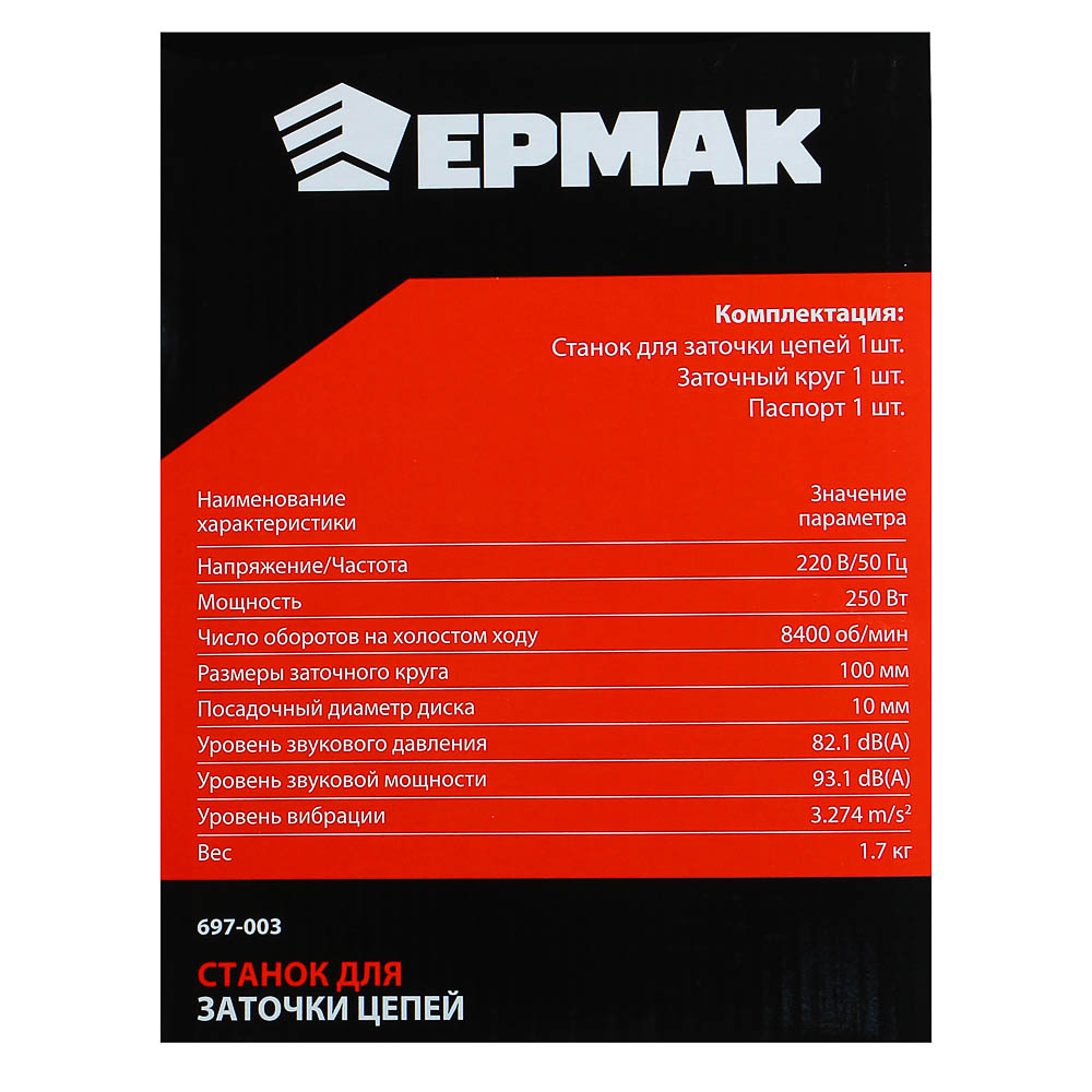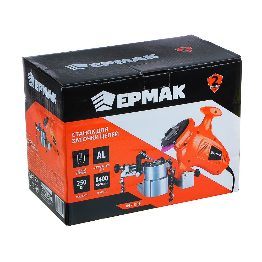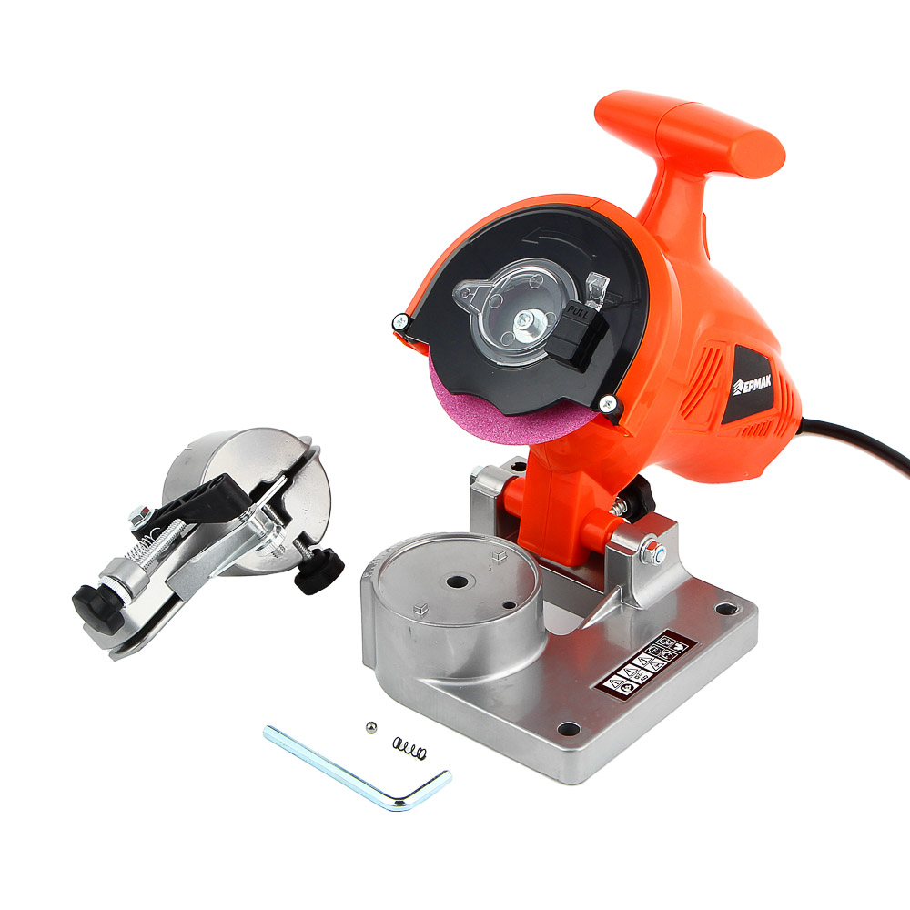 Станок для заточки цепей ЕРМАК предназначен для заточки режущей кромки звеньев цепи бензопил. Оснащен надежной алюминиевой базой. Удобно настраивается при помощи регулировочных винтов. Скорость холостого хода – до 8400 оборотов в минуту. Удобная рукоятка обеспечивает комфорт и точность в процессе заточки. В комплект входят заточный круг на 100 мм и паспорт изделия.