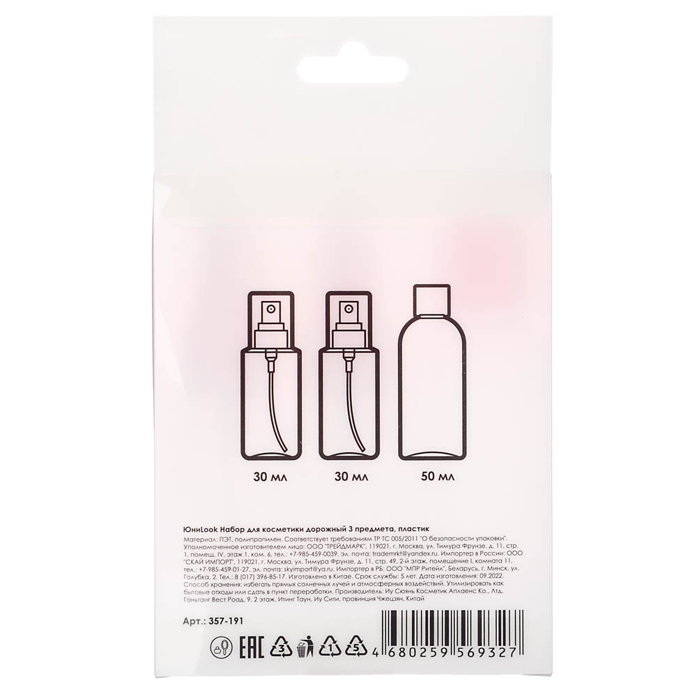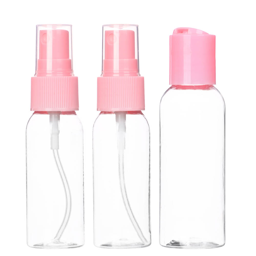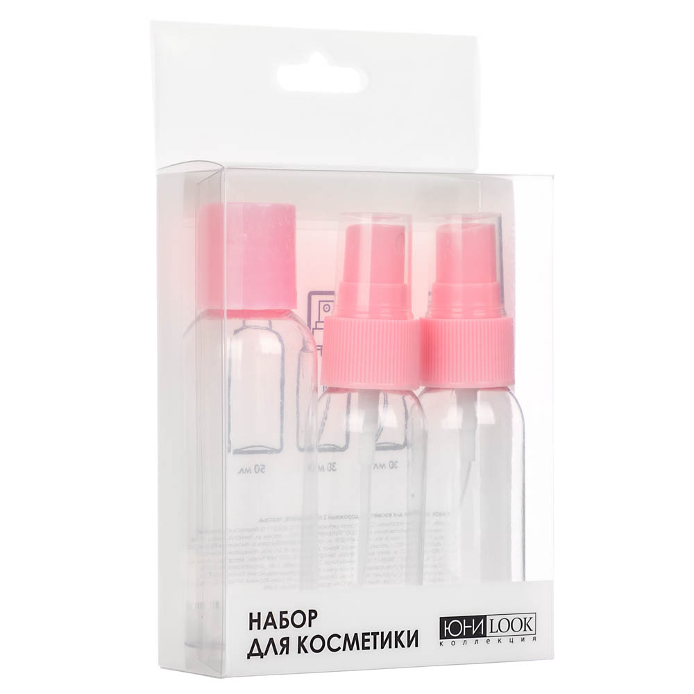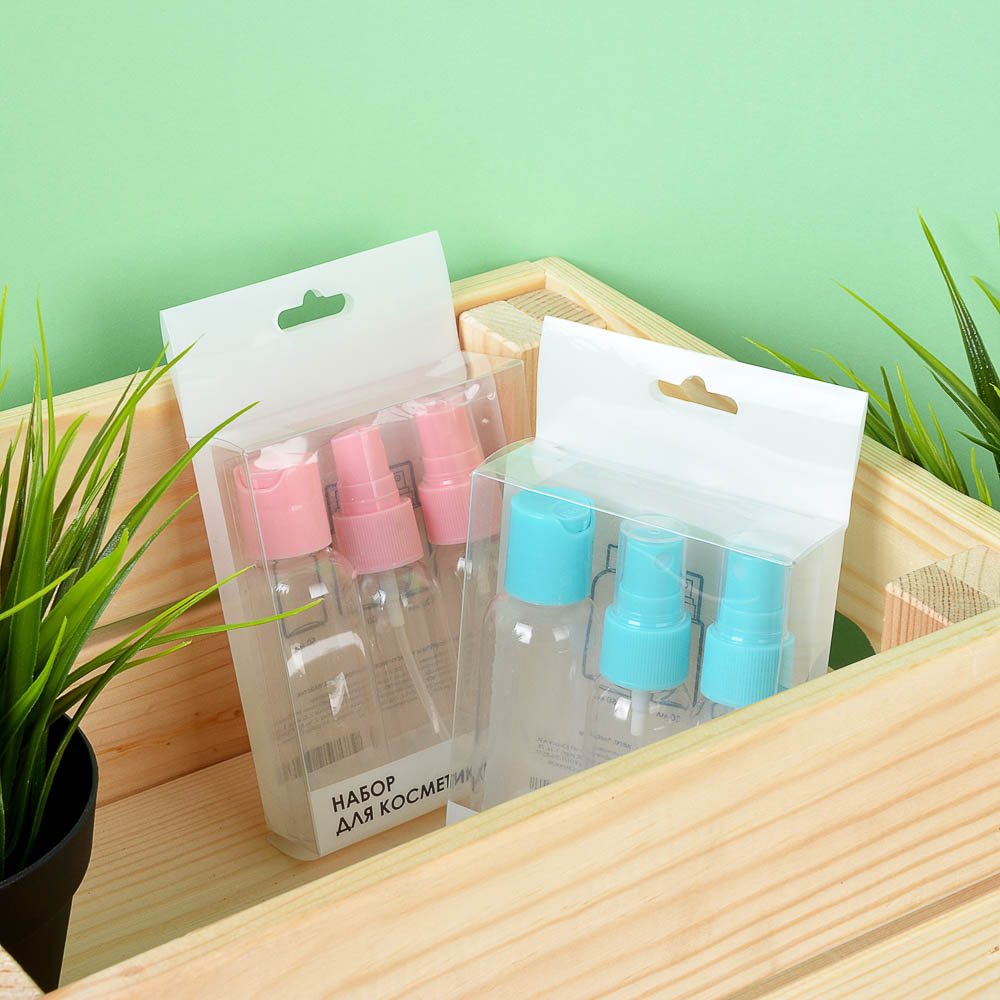 Набор дорожный из трех компактных бутылочек для хранения косметики и средств ухода. Такой набор идеален для недолгих поездок и путешествий, объем позволяет перевозить жидкость в ручной клади. Две бутылочки оснащены удобными пульверизаторами, плотные завинчивающиеся крышке предотвращают вытекание, плотный пластик легкий, но при этом достаточно прочный.