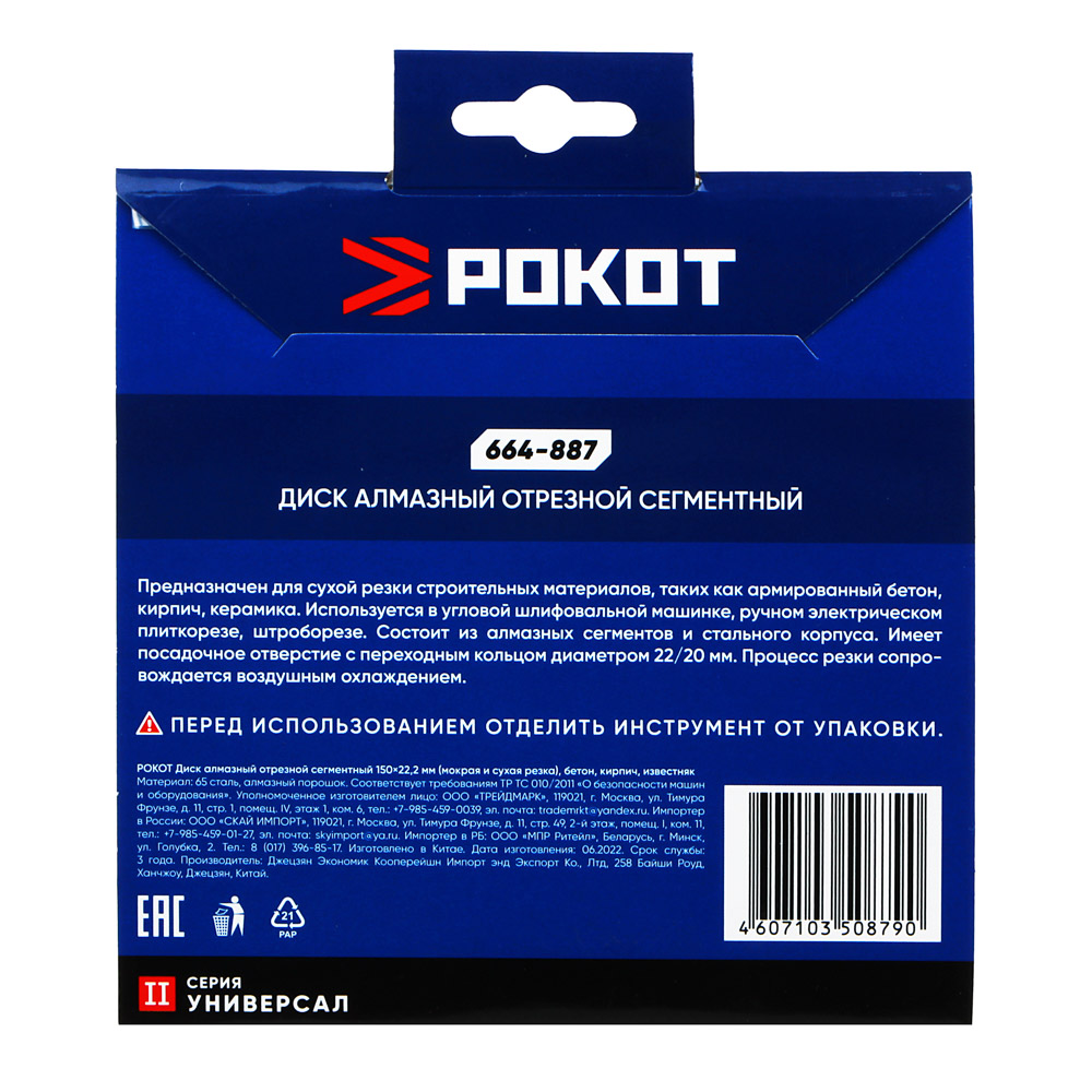 Отрезной алмазный диск РОКОТ сегментный 150х22,2 мм предназначен для сухой и мокрой резки армированного бетона, кирпича и керамики. Используется в качестве насадки для угловой шлифовальной машинки с максимальным числом оборотов в 10200 об/мин при максимальной скорости 80 м/с. Также совместим с ручным электрическим плиткорезом и штроборезом. Алмазные сегменты отличаются сверхтвердостью, обеспечивая четкий и ровный рез. Корпус из 65 стали обладает высокой прочностью и износостойкостью. Имеет посадочное отверстие с переходным кольцом диметром 22/20 мм. Процесс резки сопровождается воздушным охлаждением.