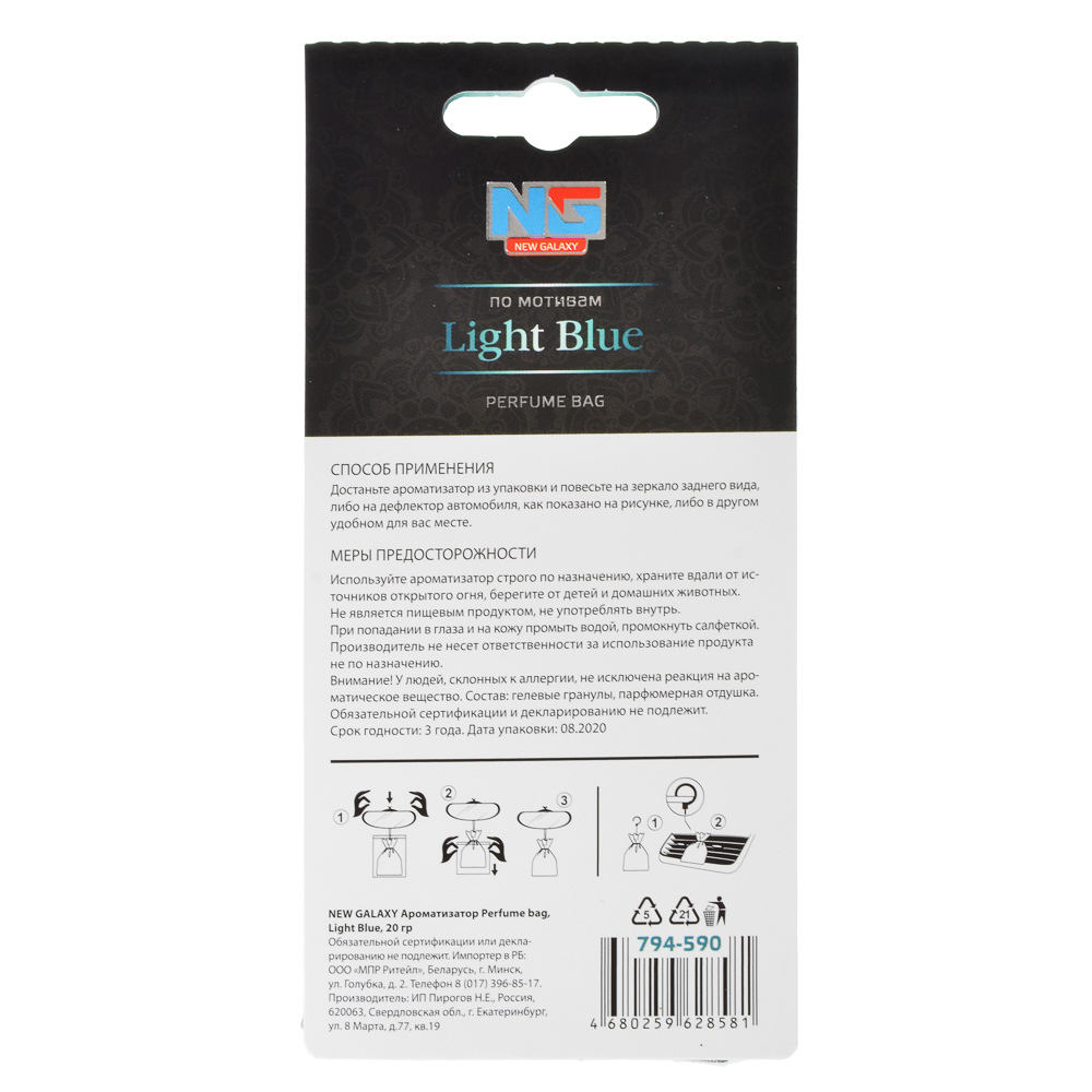 Аромат брендовой парфюмерии в автомобиле – это часть вашего индивидуального стиля! Ароматизатор Perfume Bag от NEW GALAXY в виде мешочка с гелевыми гранулами имеет узнаваемый аромат известного мужского и женского парфюма: Fahrenheit, J’adore, L’imeratrice, Light blue, Million, Shaik и подчеркнет ваш имидж. Варианты крепления: на зеркало заднего вида к вентиляционной решетке. Работает до 30 дней.