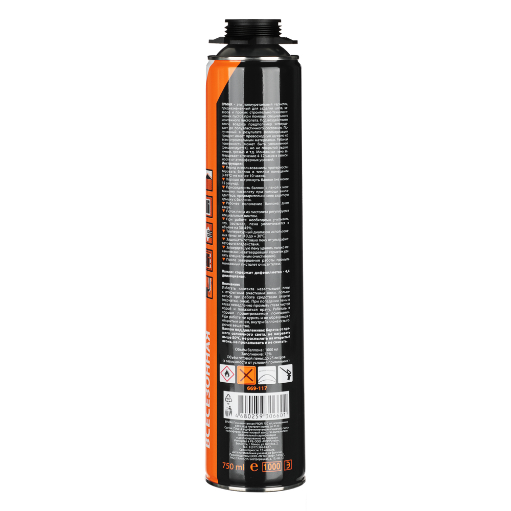 Монтажная пена используется при работе с самыми различными материалами и поверхностями во время строительства и монтажа различных конструкций. Легко заполняет щели и пустоты, герметична, изолирует тепло. Выход пены до 25 литров.