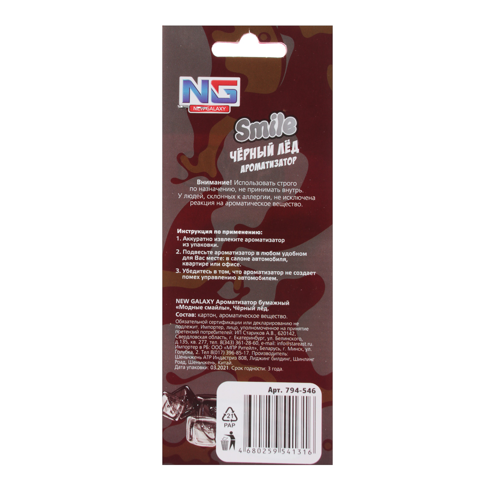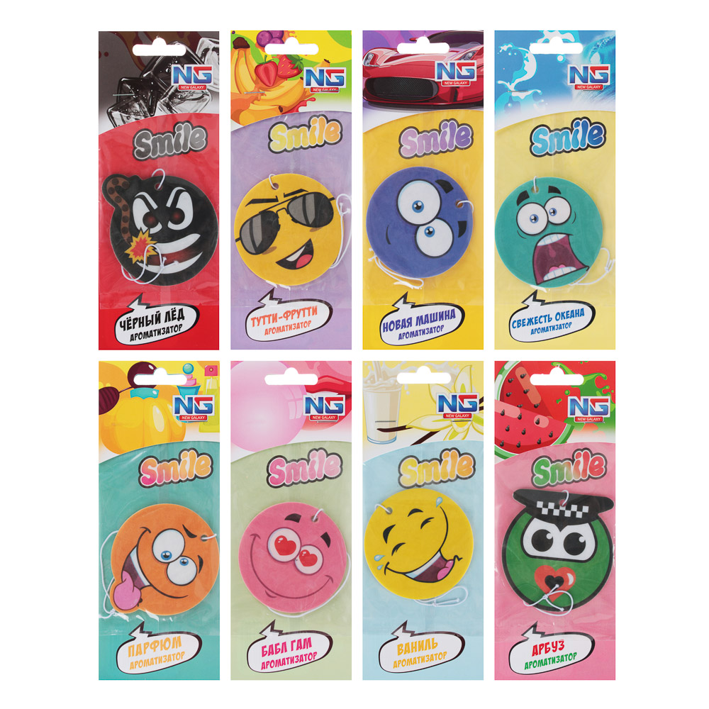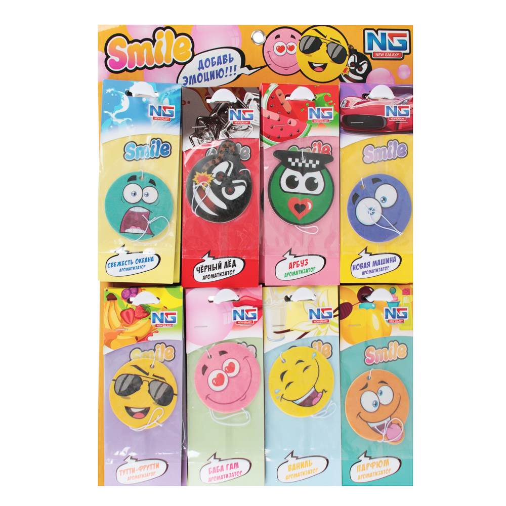 Автомобильный ароматизатор NEW GALAXY "Модные смайлы" выполнен из плотной бумаги и пропитан парфюмированым средством. В обиходе этот вид ароматизаторов еще называют "елочка". Такой освежитель воздуха может располагаться в любом месте машины и обеспечивать в салоне приятный аромат и нейтрализацию посторонних запахов на длительное время.