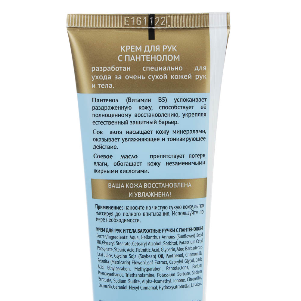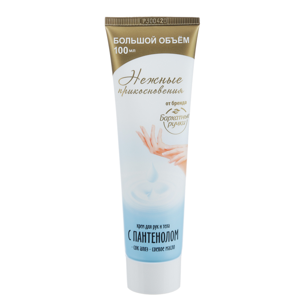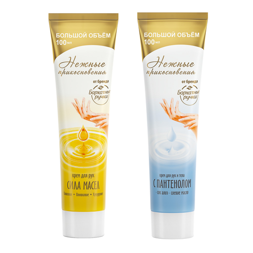 Крем для рук и тела Бархатные Ручки «Нежные прикосновения» сила масел/ с пантенолом – увлажняющие средства для ухода за кожей рук. Крем «Сила масел» содержит натуральные масла кокоса, оливы и кукурузы, которые глубоко питают кожу, проникая в клетки эпидермиса, омолаживают и предотвращают шелушения. Крем «С пантенолом» содержит соевое масло и экстракт алоэ вера, которые эффективно увлажняют очень сухую кожу, успокаивая раздражения и укрепляя естественный защитный барьер. Приятная текстура быстро впитывается, не оставляя липкости.