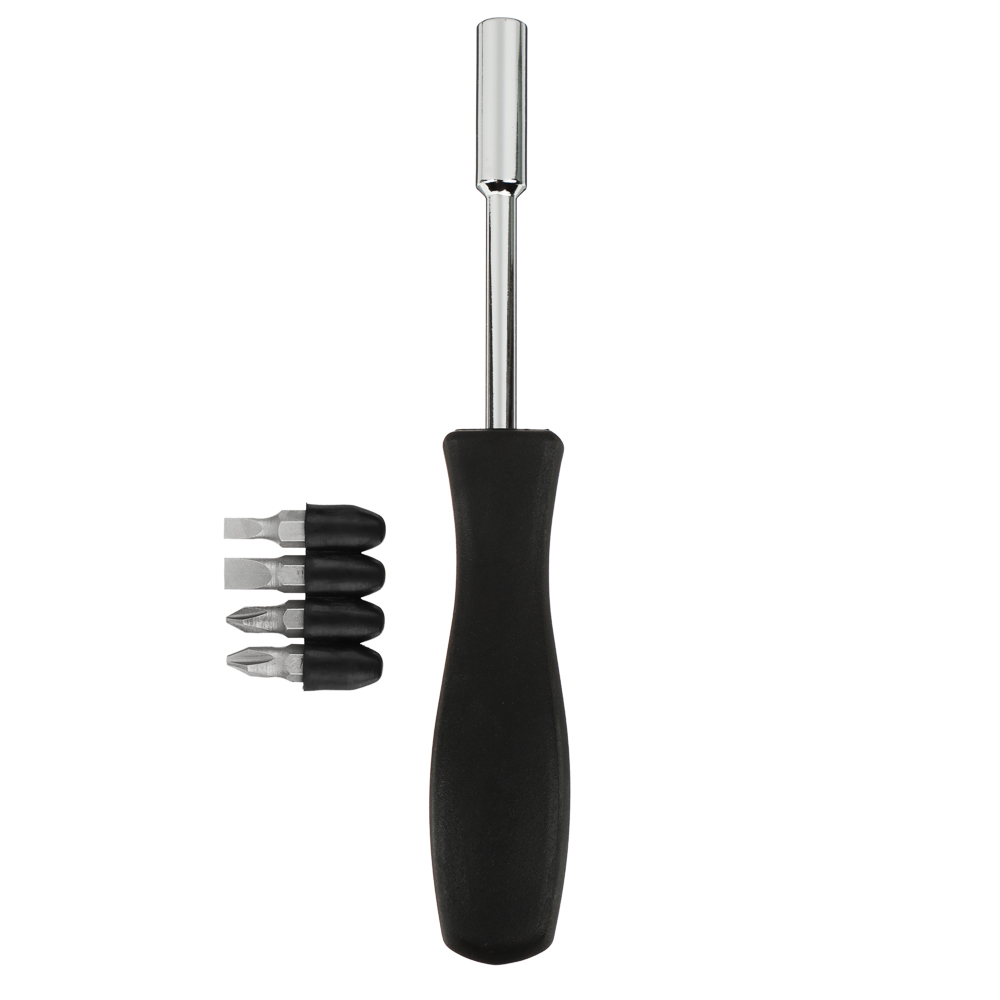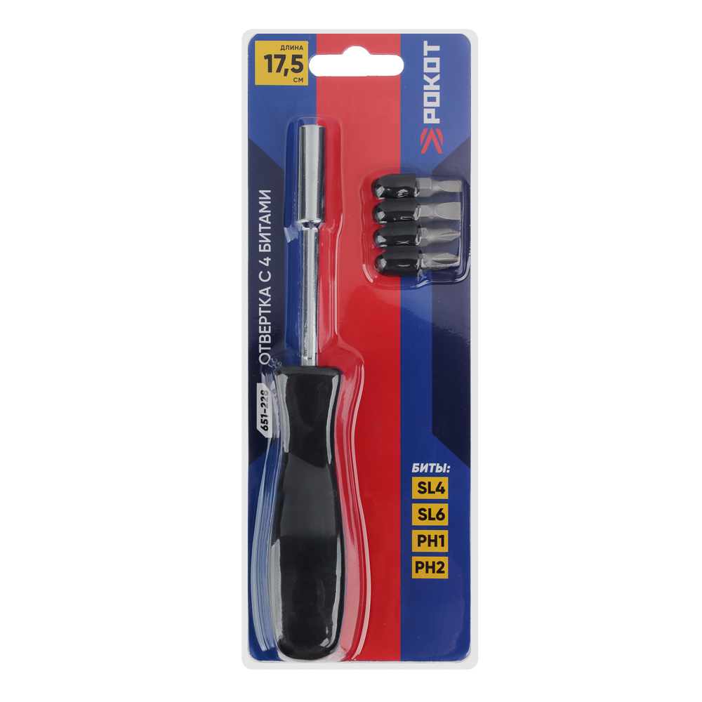 Отвертка РОКОТ с 4 битами подходит для повседневных нужд и мелкого ремонта. Комплект содержит биты популярных типов: SL4, SL6, PH1, PH2. Оснащена удобным посадочным наконечником для надежной фиксации бит. Шероховатая рукоять не скользит в руке и имеет анатомическую форму. Длина изделия – 17,5 см.