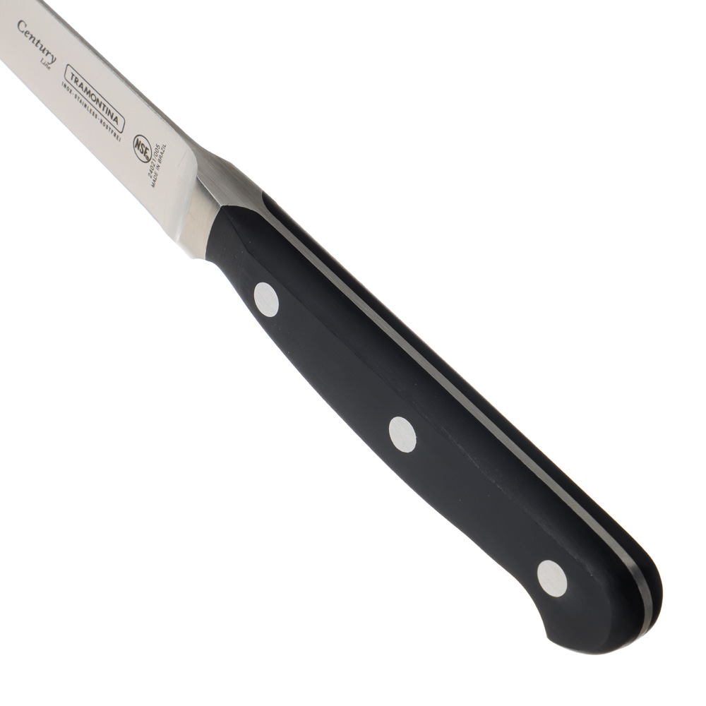 Кухонный нож Tramontina Century из долговечной антикоррозийной стали. Изготовление лезвия происходит при помощи уникальной ковки, это позволяет ножу оставаться острым значительно дольше. Ручка удобная и лёгкая, выполнена из поликарбоната.