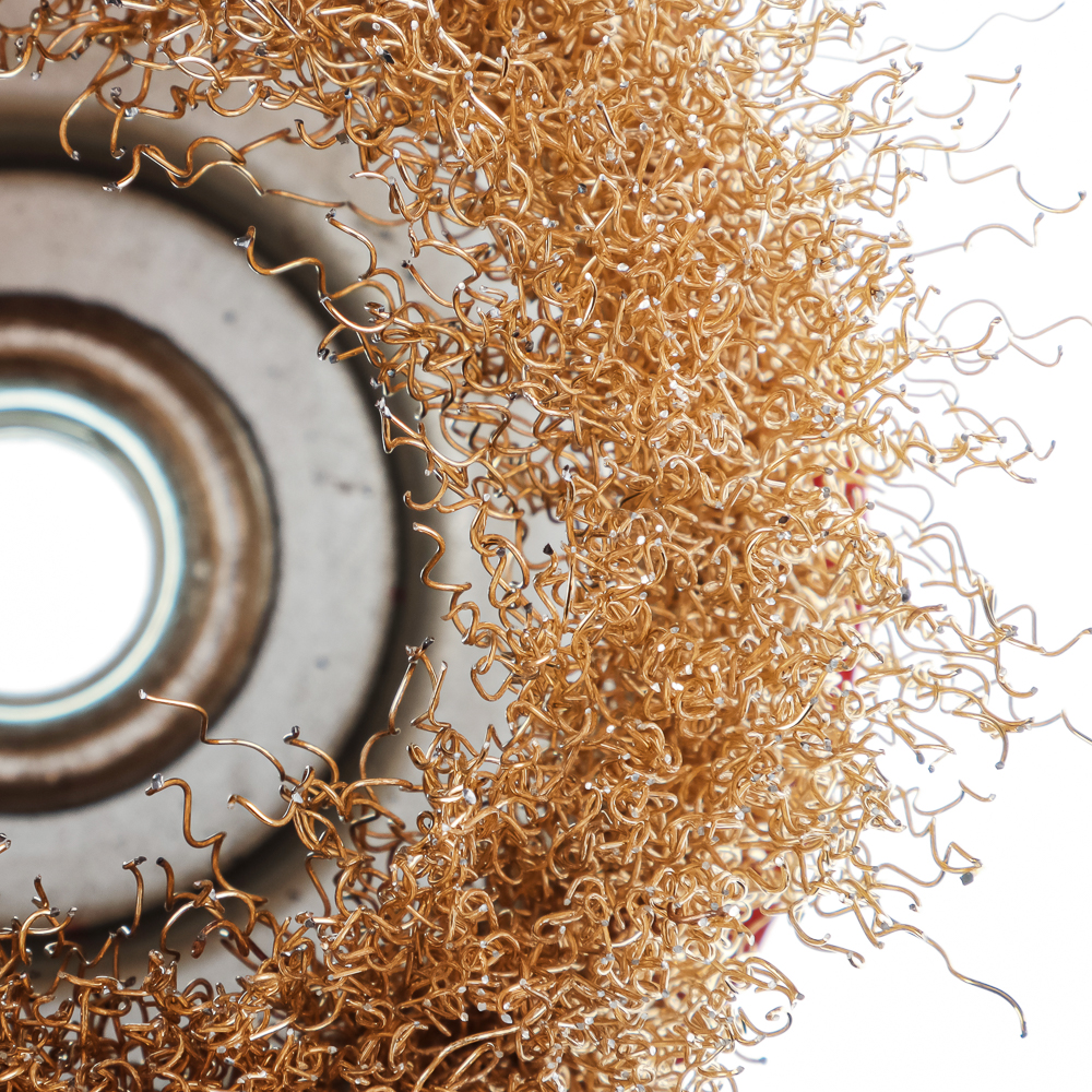 Изготовлена из стальной крученой проволоки. Такая щетка имеет высокую износостойкость и применяется при грубых зачистных работах по металлическим поверхностям, удалении окалины, ржавчины и заусенцев, сглаживании сварных швов.