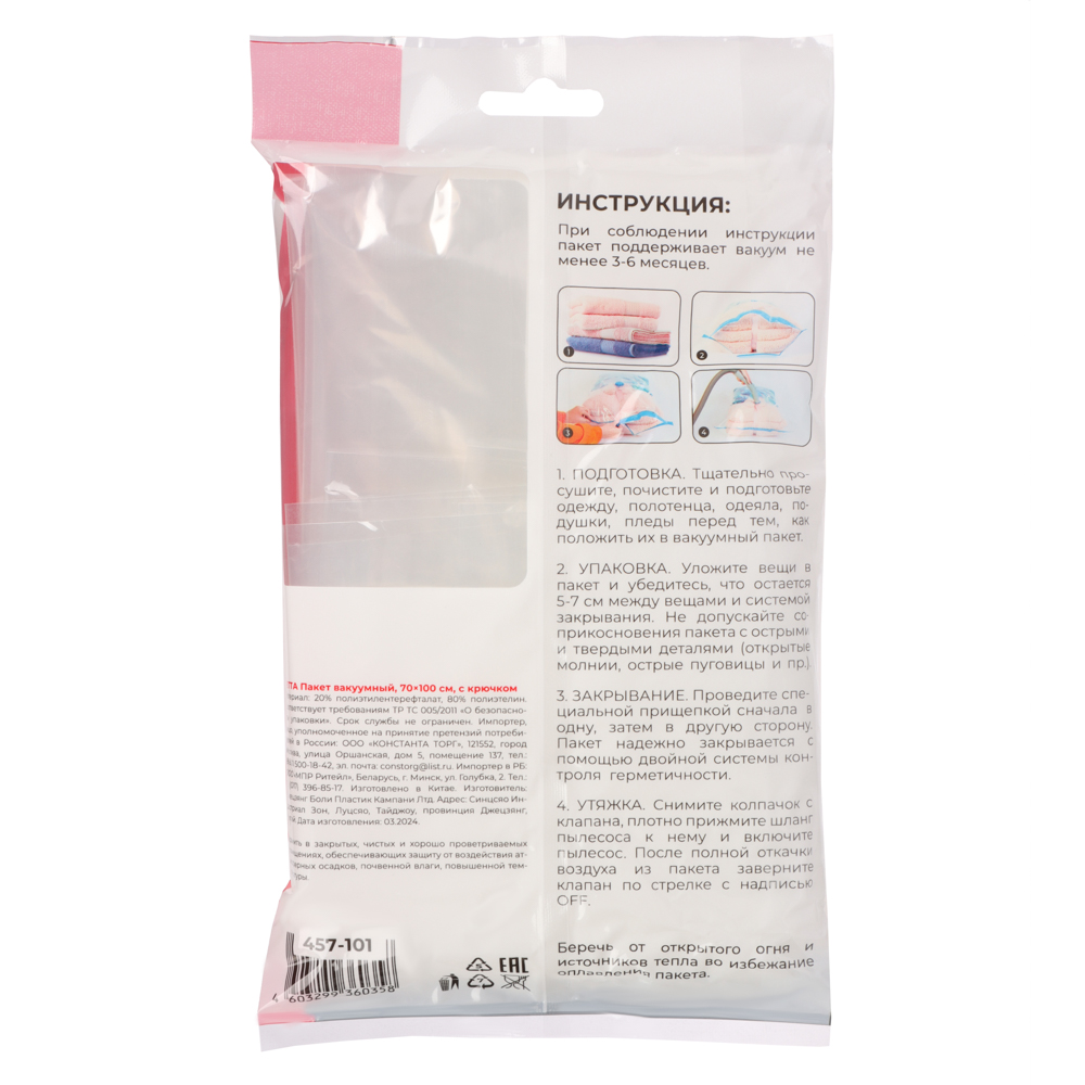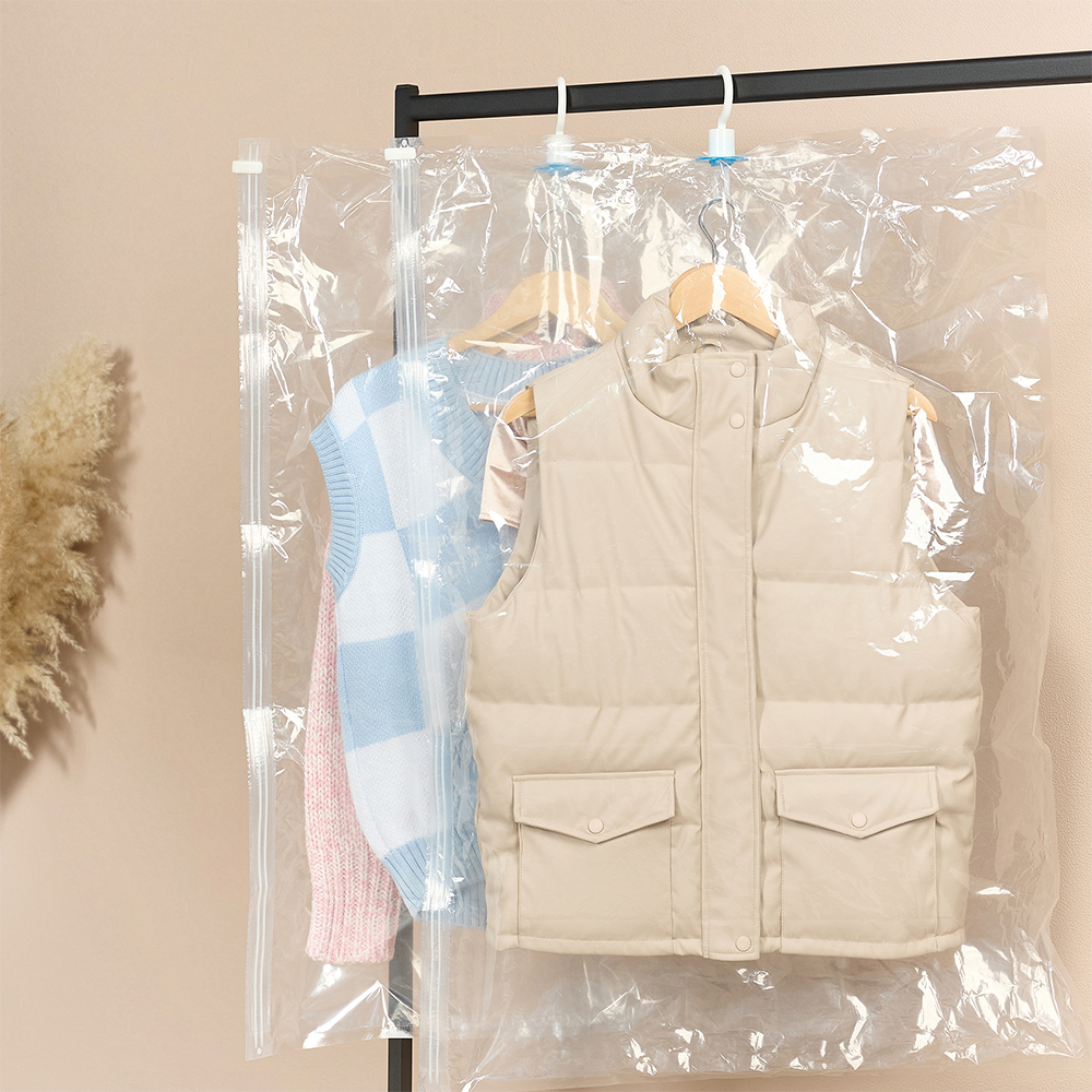 Подушки, одеяла, зимняя одежда, мягкие игрушки занимают много пространства в Вашем шкафу? Вакуумные пакеты с клапаном 70х100 см на 70% уменьшают пространство за счет откачки воздуха. Просто поместите вещи в пакет, закройте его с помощью застежки zip-lock, присоедините шланг пылесоса к клапану и откачайте воздух. А крючок в комплекте позволит удобно разместить пакеты с вещами на штанге.